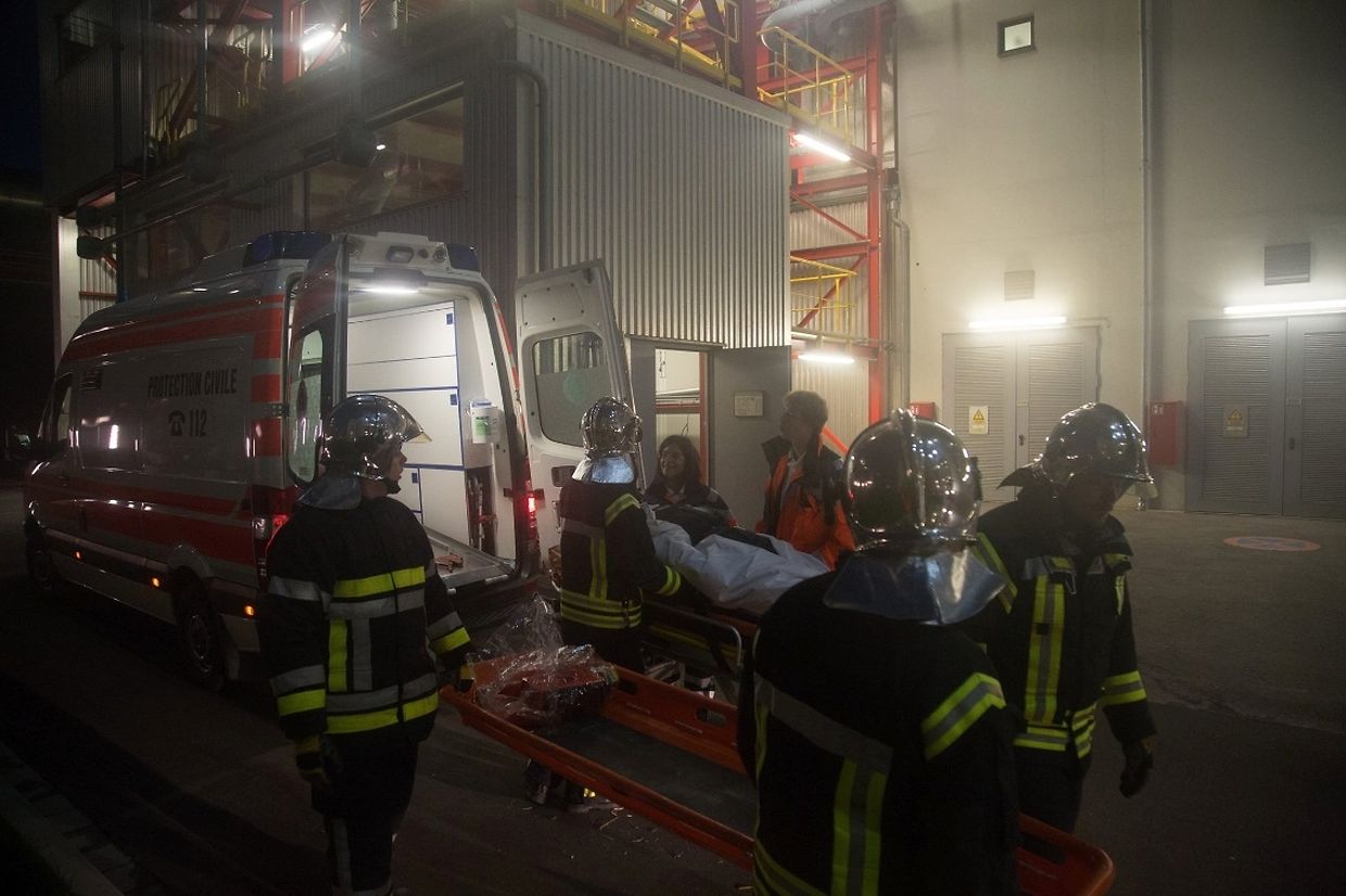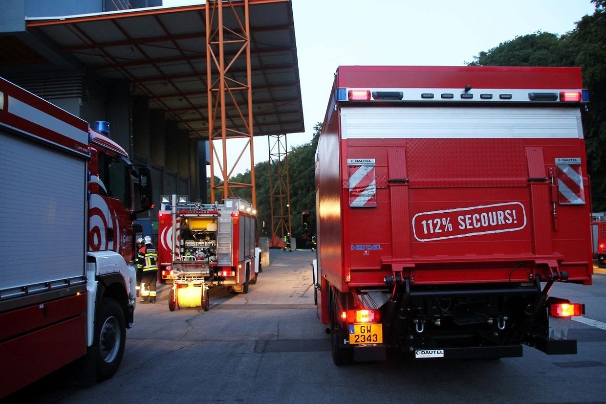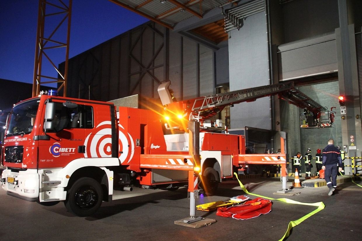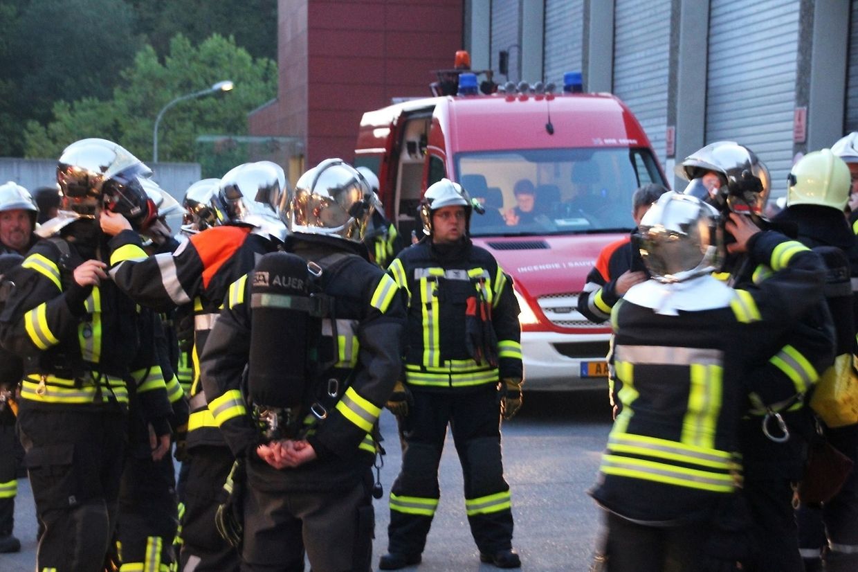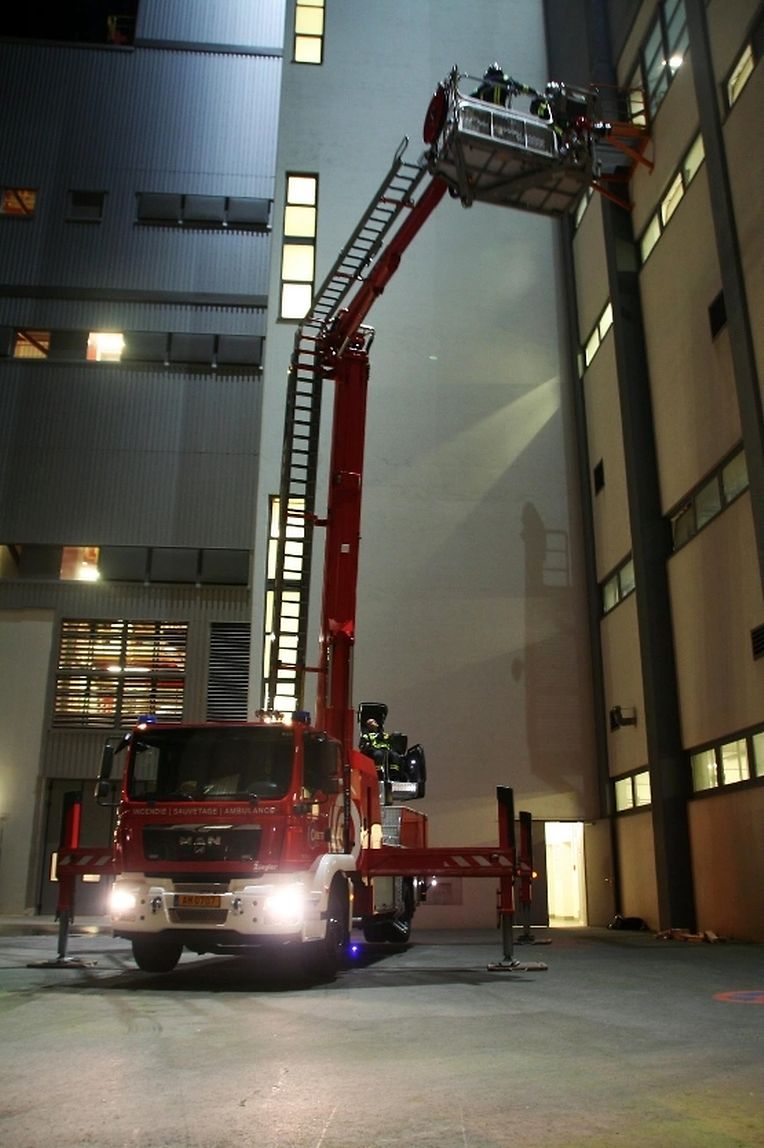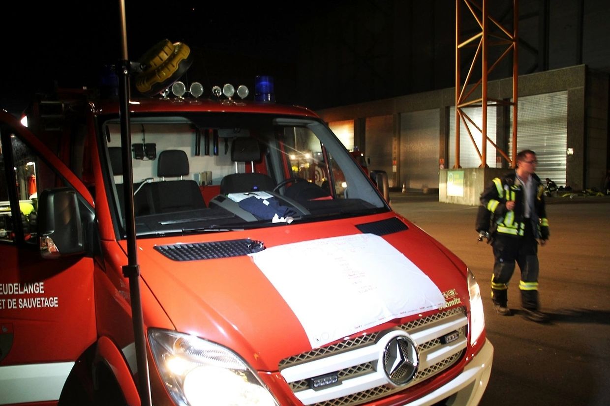 Gegen 19:40 Uhr wurden die Feuerwehren aus Leudelingen und Bettemburg gleichzeitig mit der Meldung „AG Feier – SIDOR Leudelange – Brand im Müllbunker“ alarmiert. Die Feuerwehr Leudelingen, welche als Erster vor Ort war, übernahm die erste Erkundung mit Hilfe der am Eingang bereitgestellten Notfallplänen des Betriebs. Schnell war klar dass es sich hierbei um keinen gewöhnlichen Einsatz handeln würde: Das Treppenhaus war auf Grund des Brandes bis auf eine Höhe von 23m vollständig verraucht, 3 Personen wurden vermisst, weitere Arbeiter waren im Kontrollzentrum vom Rauch eingeschlossen worden. Unter schwerem Atemschutz drangen die Einsatzkräfte in den verrauchten Bereich vor, um nach möglichen Opfern zu suchen. Diese konnten sehr schnell im Treppenhaus, sowie im oberen Bereich des Müllbunkers lokalisiert werden. Ein weiteres Opfer war in den Bunker gestürzt und befand sich in etwa 10m Tiefe. Der Atemschutztrupp lokalisierte die Arbeiter des Kontrollzentrums. Da diese aber zum aktuellen Zeitpunkt nicht in unmittelbarer Gefahr waren, hatten die verletzten Arbeiter Vorrang. Während die Rettung der beiden erstgenannten Opfer schnell durch Atemschutztrupps über das Treppenhaus erfolgen konnte, gestaltete sich die Rettung des abgestürzten Arbeiter komplizierter. Mit Hilfe des Teleskopmastfahrzeuges der Feuerwehr Bettemburg wurde ein mit schwerem Atemschutz ausgerüsteter Feuerwehrmann zu dem Verunfallten abgeseilt. Das Opfer wurde in einer Korbschleiftrage fixiert und mittels mehreren Sicherheitsleinen von den Einsatzkräften aus dem Bereich gerettet. Dabei galt es sowohl das Opfer wie auch alle beteiligten Einsatzkräfte während der gesamten Arbeitsdauer im Gefahrenbereich zu sichern.