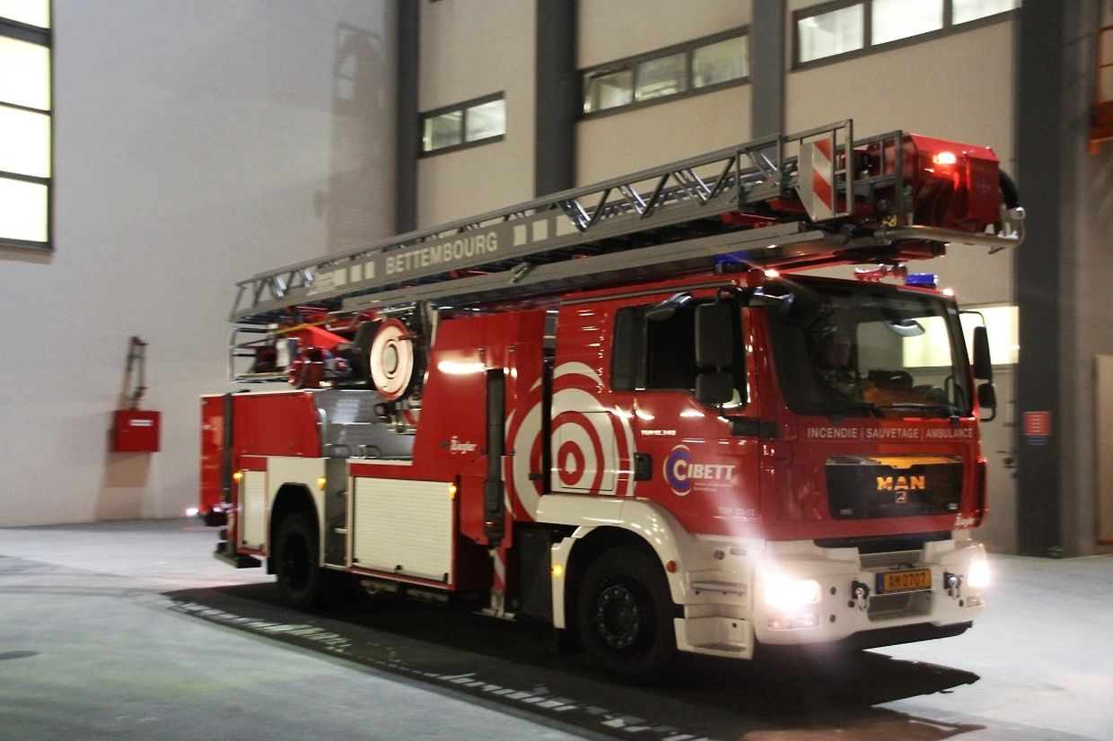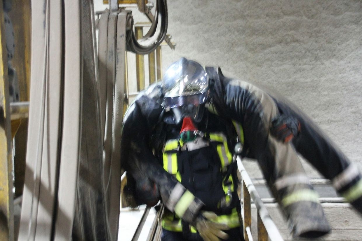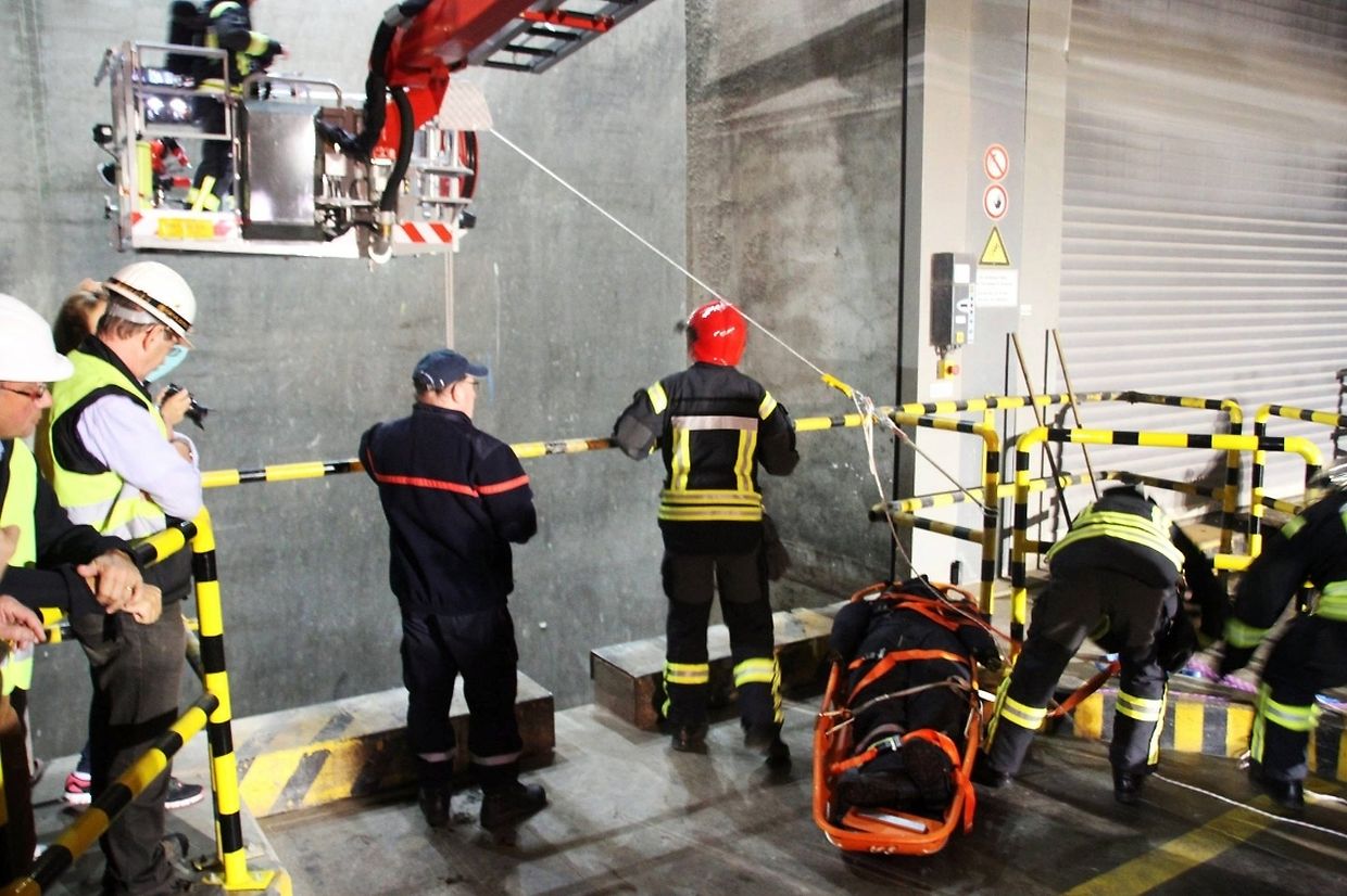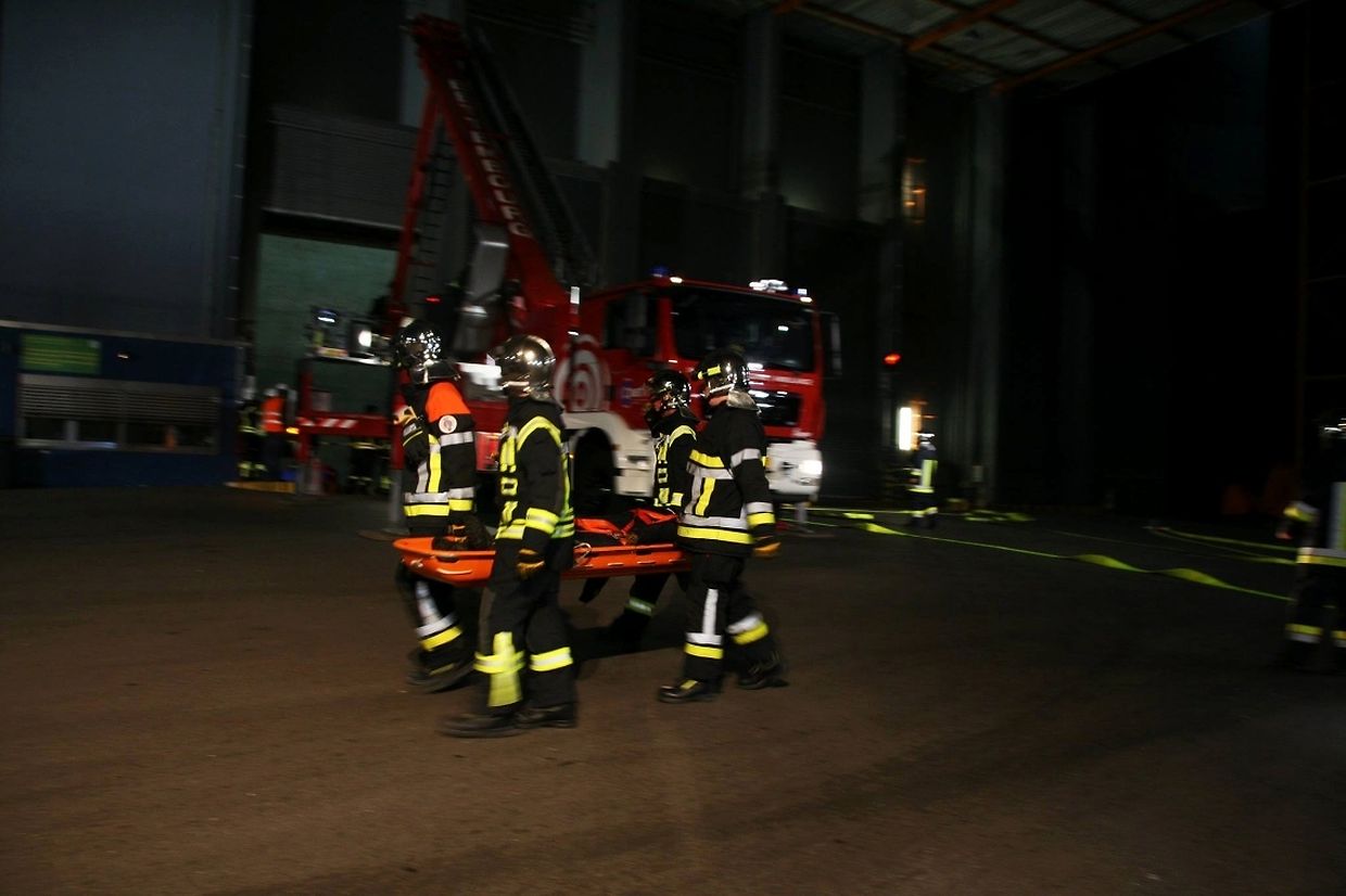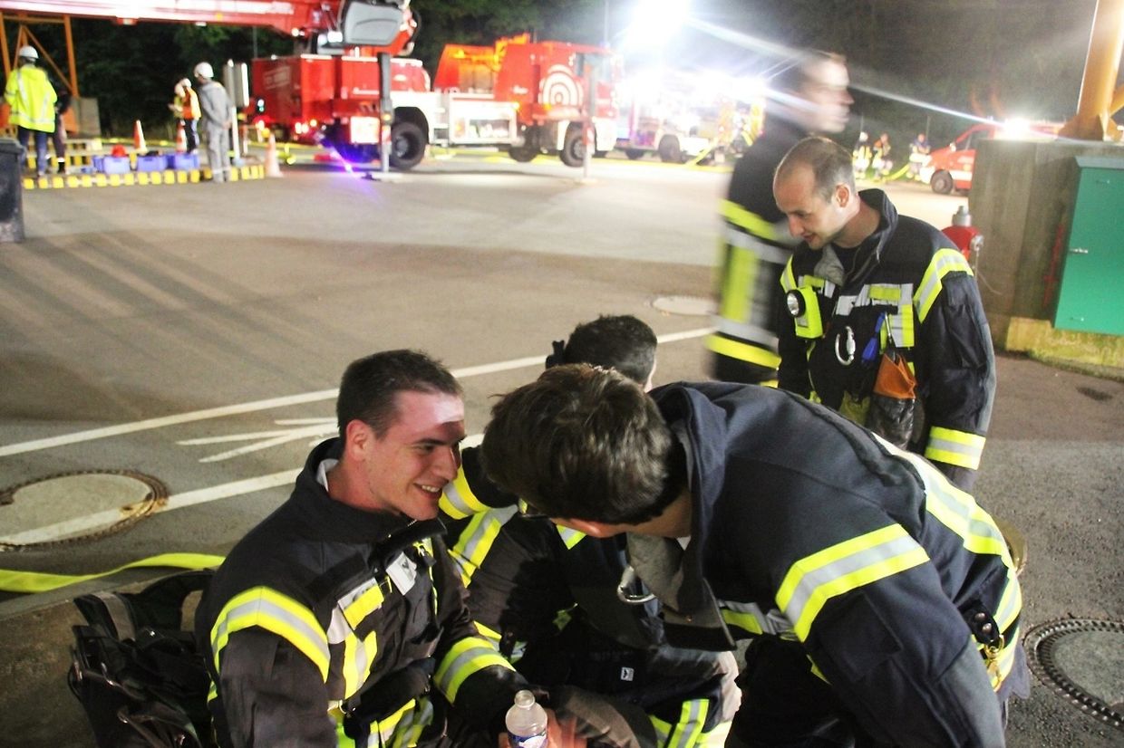 Gegen 19:40 Uhr wurden die Feuerwehren aus Leudelingen und Bettemburg gleichzeitig mit der Meldung „AG Feier – SIDOR Leudelange – Brand im Müllbunker“ alarmiert. Die Feuerwehr Leudelingen, welche als Erster vor Ort war, übernahm die erste Erkundung mit Hilfe der am Eingang bereitgestellten Notfallplänen des Betriebs. Schnell war klar dass es sich hierbei um keinen gewöhnlichen Einsatz handeln würde: Das Treppenhaus war auf Grund des Brandes bis auf eine Höhe von 23m vollständig verraucht, 3 Personen wurden vermisst, weitere Arbeiter waren im Kontrollzentrum vom Rauch eingeschlossen worden. Unter schwerem Atemschutz drangen die Einsatzkräfte in den verrauchten Bereich vor, um nach möglichen Opfern zu suchen. Diese konnten sehr schnell im Treppenhaus, sowie im oberen Bereich des Müllbunkers lokalisiert werden. Ein weiteres Opfer war in den Bunker gestürzt und befand sich in etwa 10m Tiefe. Der Atemschutztrupp lokalisierte die Arbeiter des Kontrollzentrums. Da diese aber zum aktuellen Zeitpunkt nicht in unmittelbarer Gefahr waren, hatten die verletzten Arbeiter Vorrang. Während die Rettung der beiden erstgenannten Opfer schnell durch Atemschutztrupps über das Treppenhaus erfolgen konnte, gestaltete sich die Rettung des abgestürzten Arbeiter komplizierter. Mit Hilfe des Teleskopmastfahrzeuges der Feuerwehr Bettemburg wurde ein mit schwerem Atemschutz ausgerüsteter Feuerwehrmann zu dem Verunfallten abgeseilt. Das Opfer wurde in einer Korbschleiftrage fixiert und mittels mehreren Sicherheitsleinen von den Einsatzkräften aus dem Bereich gerettet. Dabei galt es sowohl das Opfer wie auch alle beteiligten Einsatzkräfte während der gesamten Arbeitsdauer im Gefahrenbereich zu sichern.