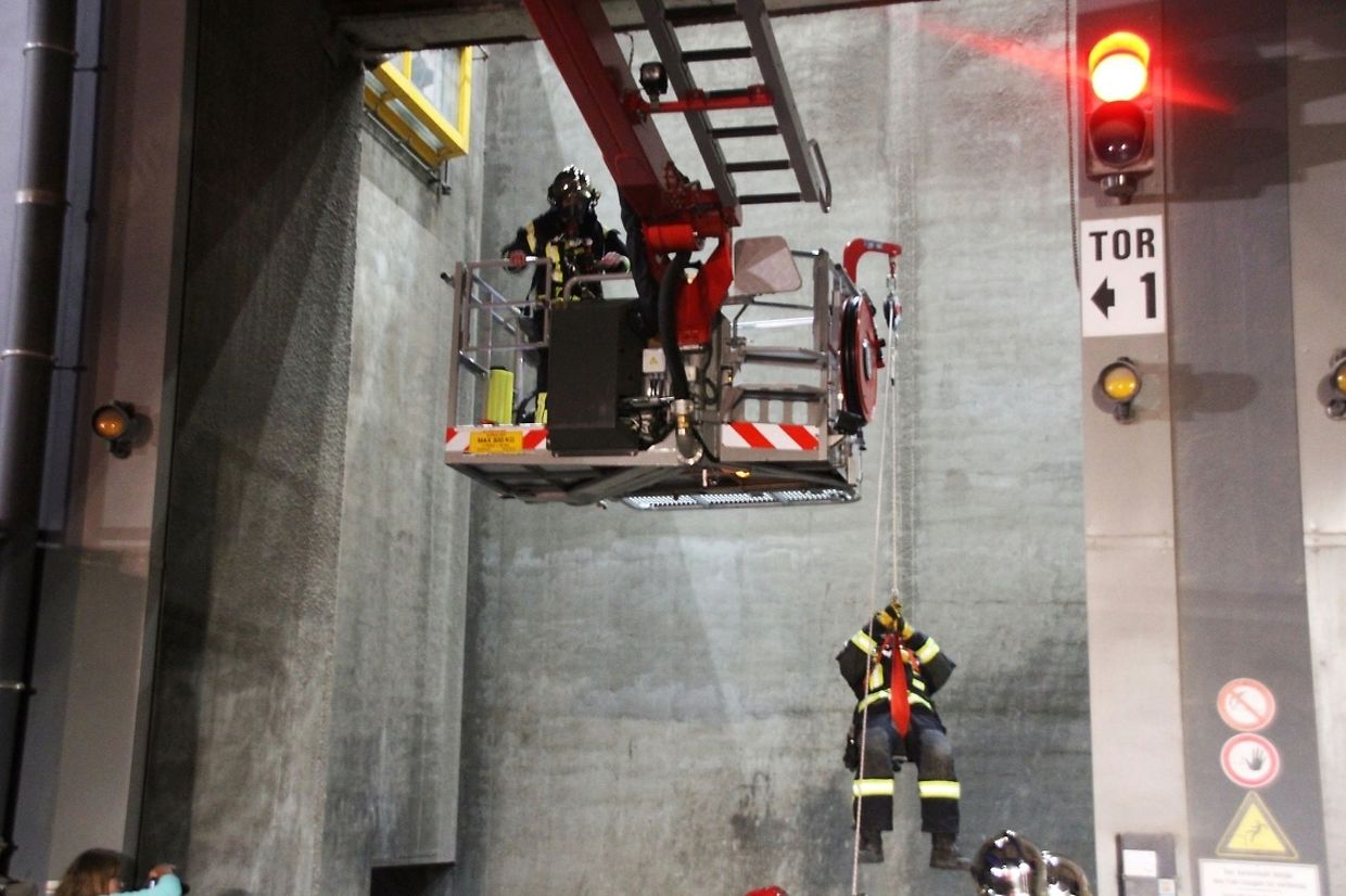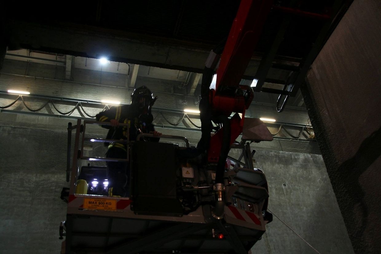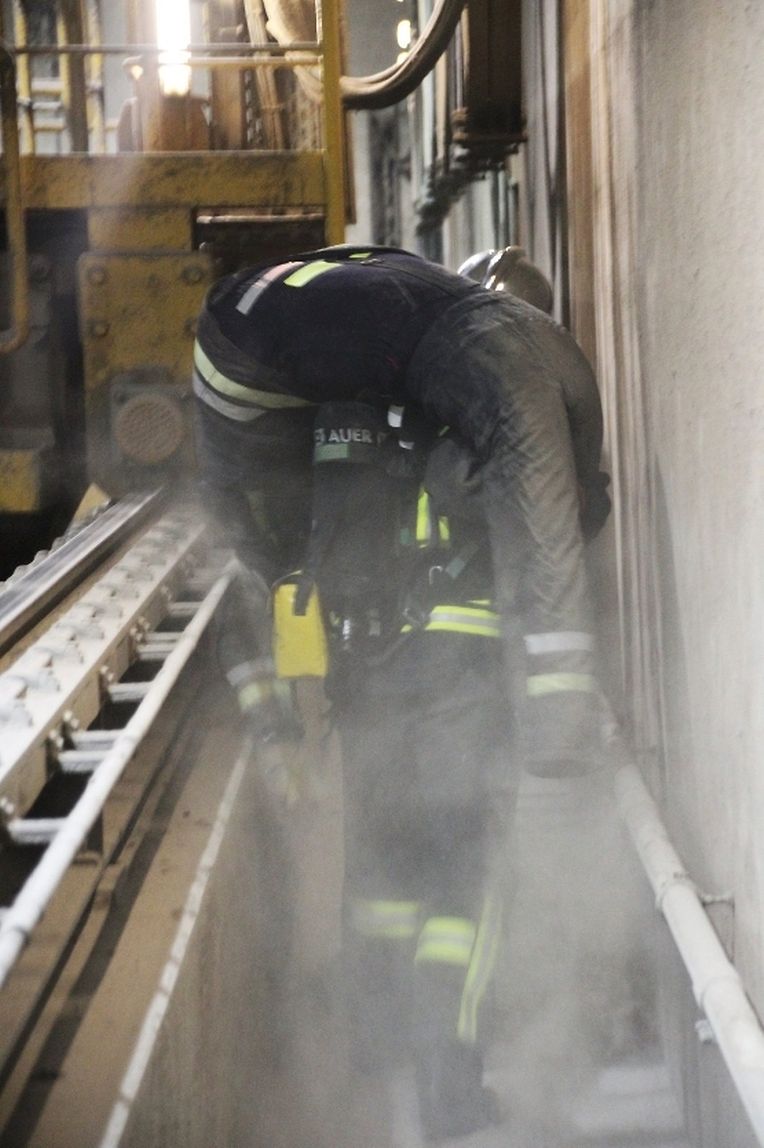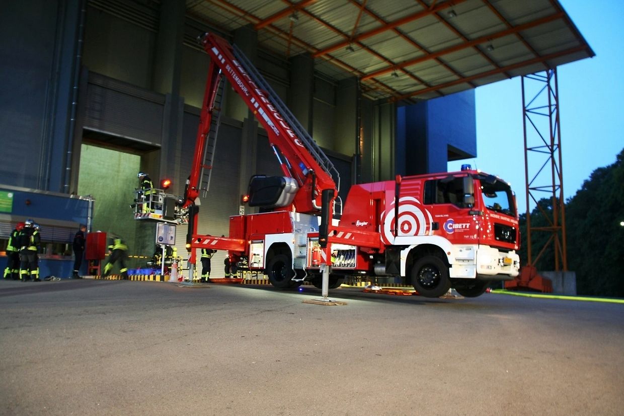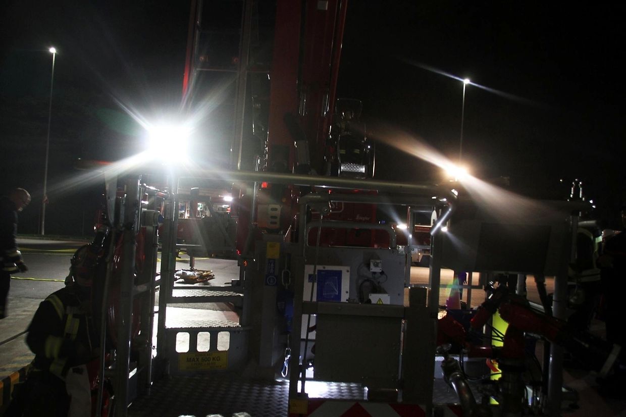 Anschließend mussten die Arbeiter des Kontrollzentrums mittels Teleskopmastfahrzeug aus einer Höhe von etwa 23m gerettet werden. Da dieser Bereich durch eine Brandschutztür vom Rauch abgeschirmt war, konnten diese ohne größeren Zeitdruck evakuiert werden.