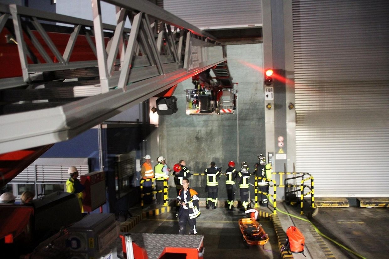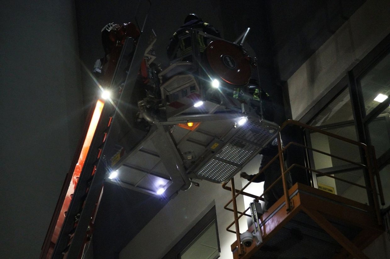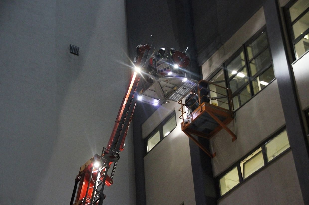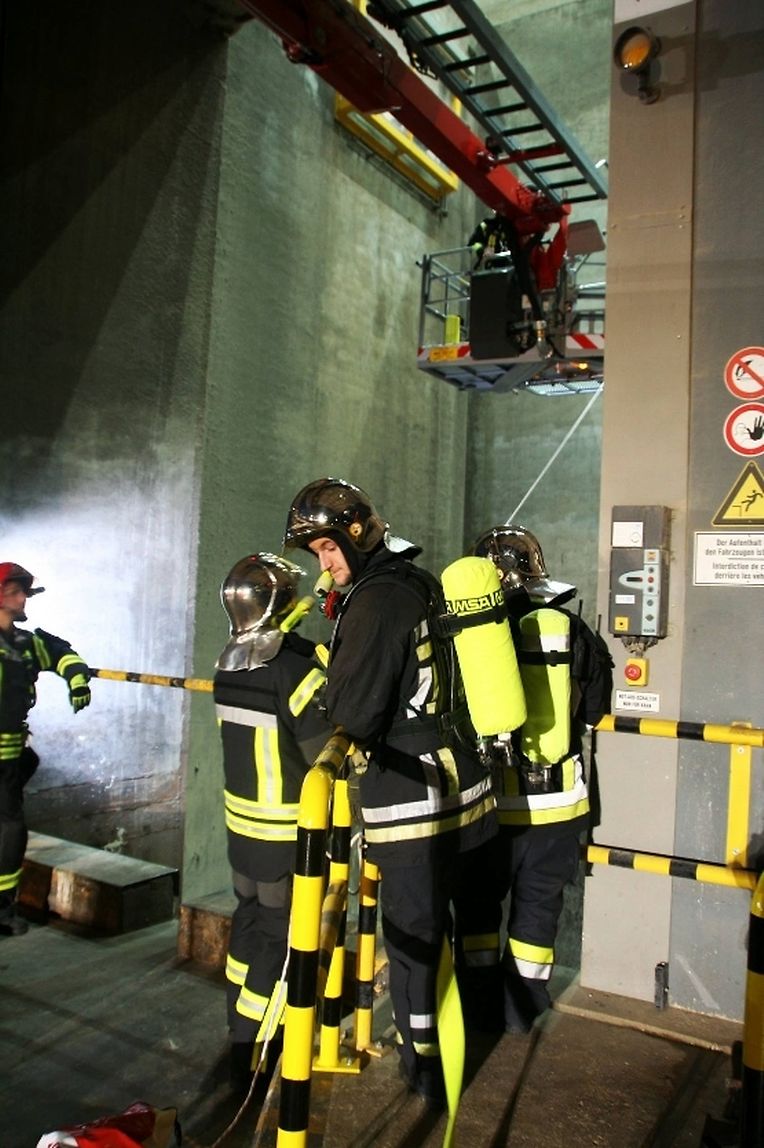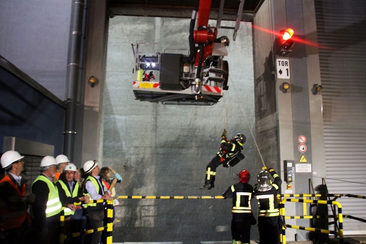 Anschließend mussten die Arbeiter des Kontrollzentrums mittels Teleskopmastfahrzeug aus einer Höhe von etwa 23m gerettet werden. Da dieser Bereich durch eine Brandschutztür vom Rauch abgeschirmt war, konnten diese ohne größeren Zeitdruck evakuiert werden.