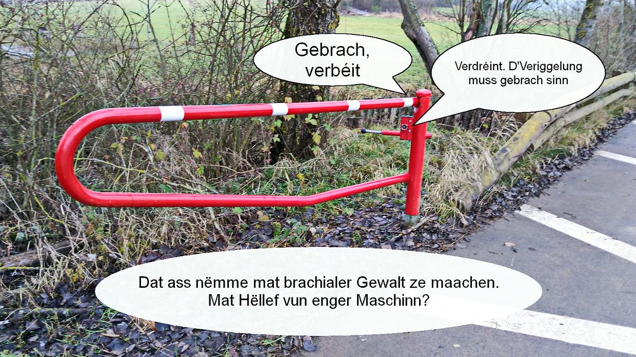 Vandalismus. Firwat mussen op de Velospisten Barrièreën opgestallt ginn. Ma kloër: fir dat de Velosfuerer an och de Fousgänger sech do sécher bewege kënnen. Leider ginn d'Schëlter dacks net respektéiert, dofir d'Barrièreë. Ma elo huet een oder e puer gemengt, dat d'Regele net fir si gëllen, si hunn sech hiir !Fräiheet! geholl. Mir gesinn ëmmer méi dacks, dat Zesummeliewen gestéiert ass, well den EGO ëmmer méi grouss gëtt