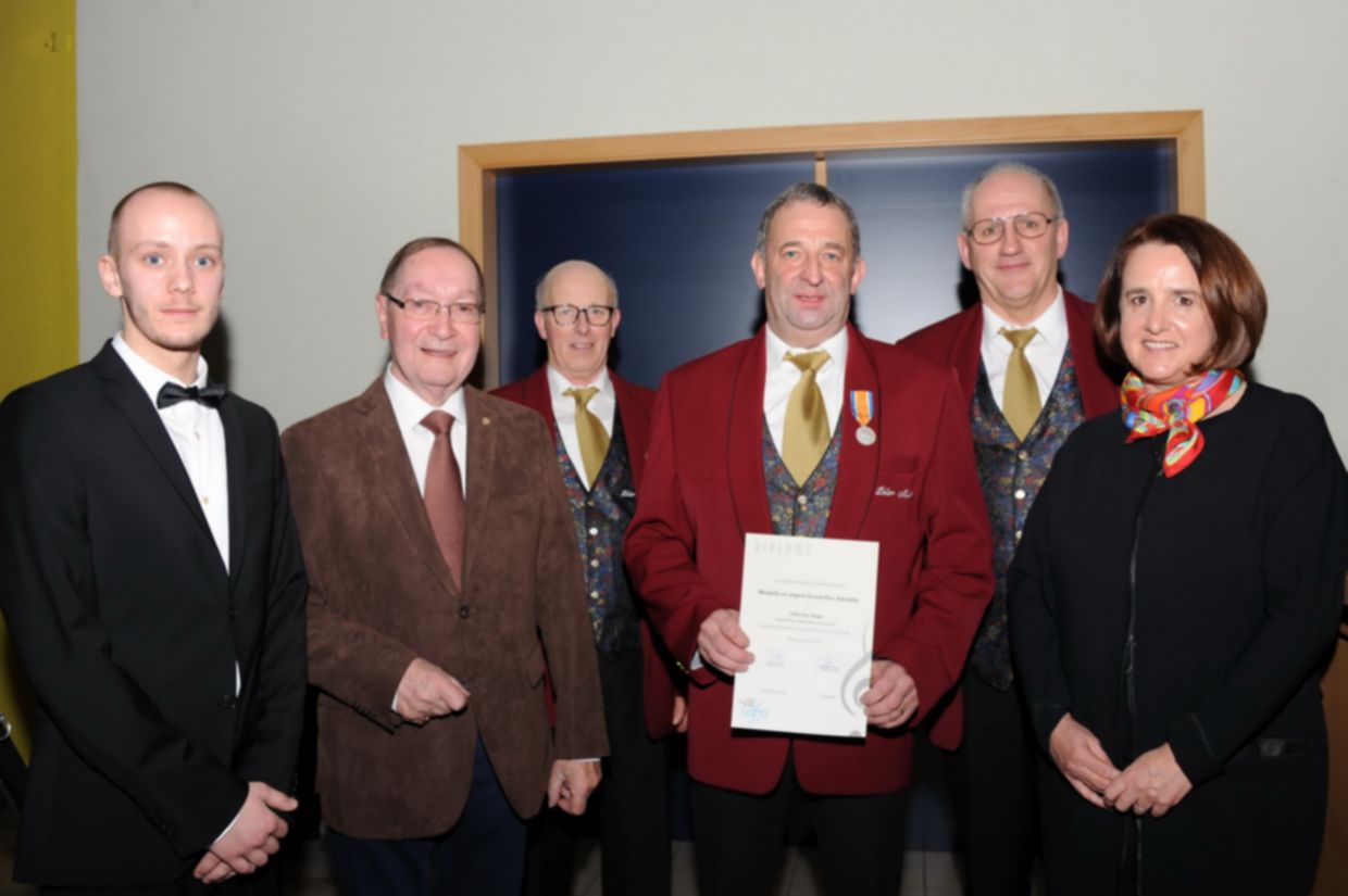Während der Pause zeichnete UGDA-Vizepräsident Raymond Peters den langjährigen Musikanten Roger Freichel mit der "Médaille en argent Grand-Duc Adolphe" aus. Auch im Namen der Gemeinde Clerf beglückwünschte Rätin Romy Karier den Musikanten für das langjährige Engagement und Treue in der Musikgruppe.