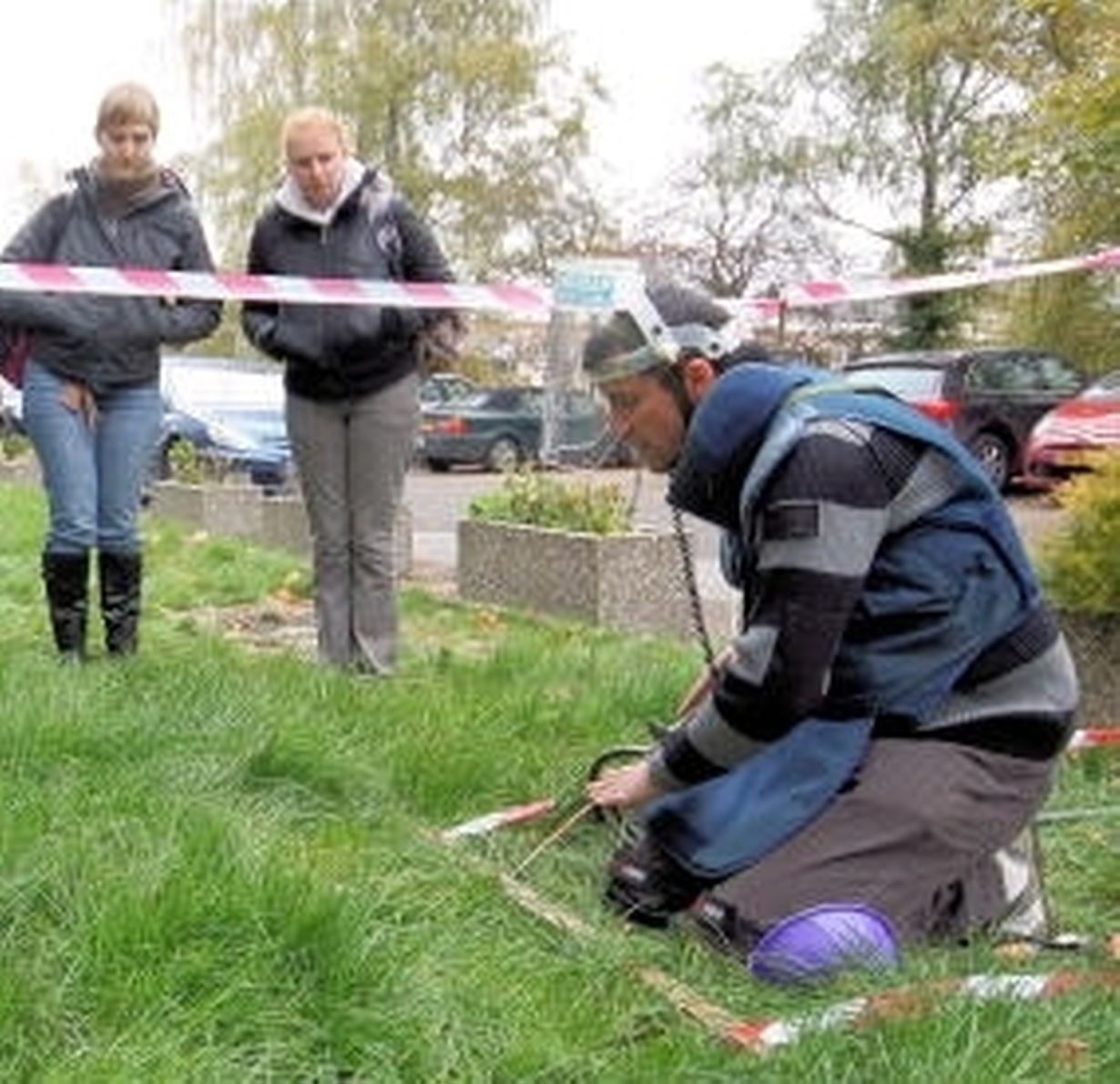 Den Schülern wurden die verschiedenen Minen und deren Funktionsweise erklärt, während sie dann eine fingierte Minensuche und Entschärfung im freien Gelände mitverfolgen konnten.