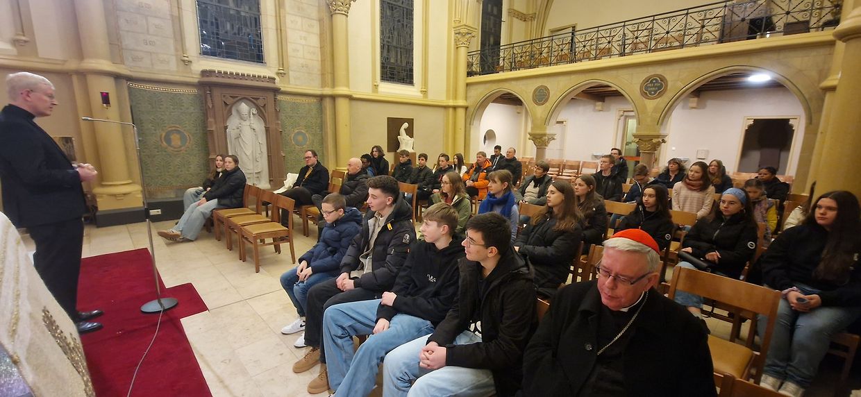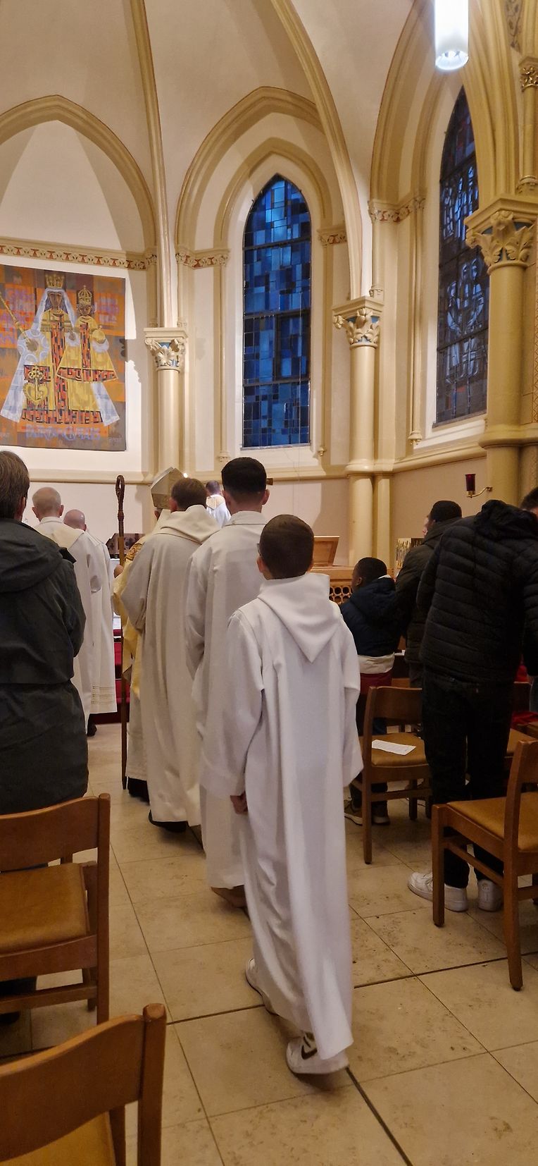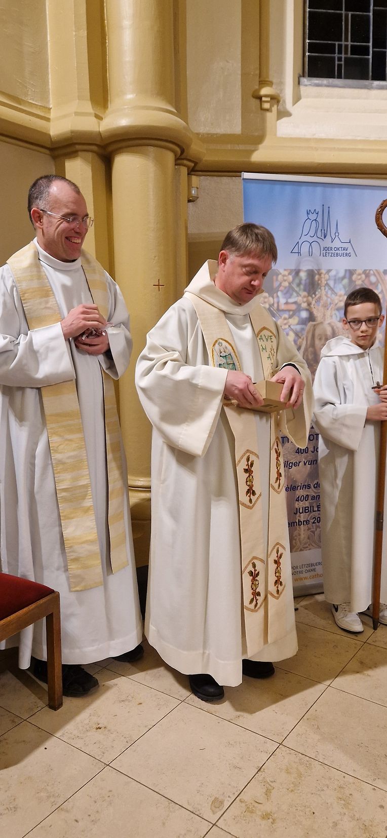 An der nei renovéierter Glacis-Kapell konnte mir zesumme mat eisem Äerzbëschof Jean-Claude Kardinol Hollerich SJ, den äis als CIM-Präsident och zu Roum schonn déi ganz Rees iwwer begleet hat, a mam Rektor vun der Glacis-Kapell, eisem Generalvikar Chanoine Patrick Muller, d´Sonndesmass zur Éier vun der Tréischterin am Leed feieren. Um Ufank vum marianesche Jubiläumsjoer an eiser Diözees a vum Hellege Joer huet eisen Här Äerzbëschof de Massendénger a Massendéngerinne Merci gesot a si fir hiren Déngscht encouragéiert.