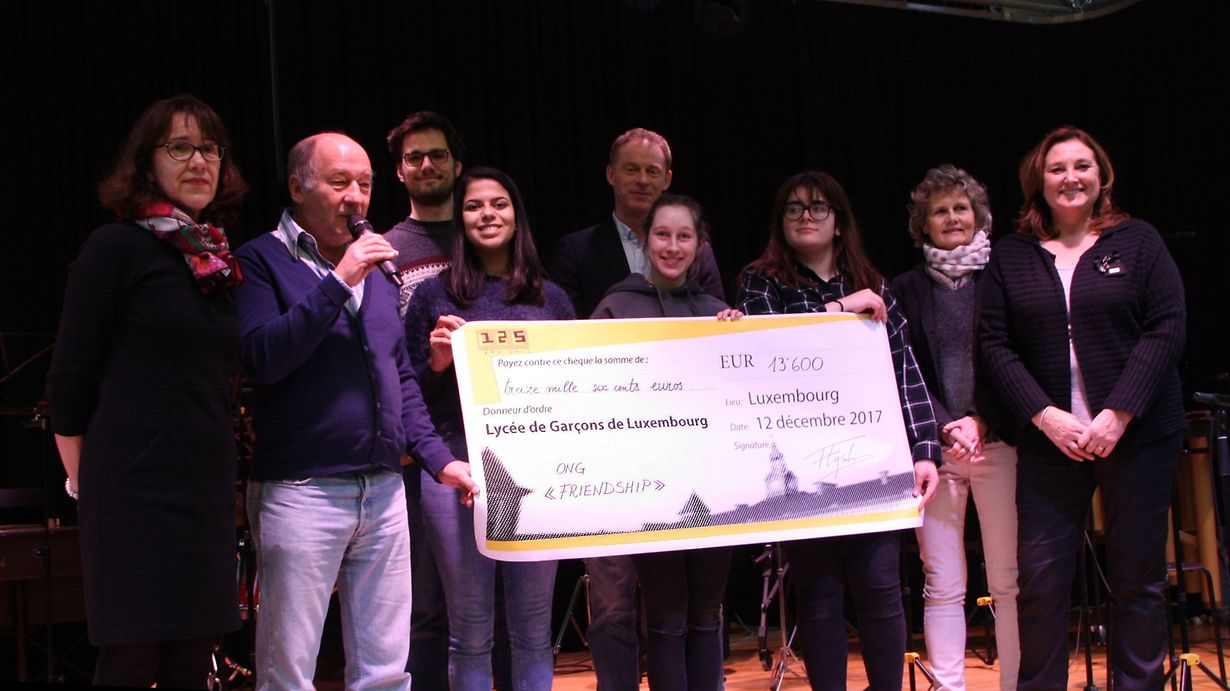 Le mardi, 12 décembre 2017, le Lycée de Garçons de Luxembourg a invité toute la communauté scolaire à son traditionnel «Marché de Noël». C’est lors de cette activité que les responsables du «Dîner de bienfaisance», organisé le 20 octobre dans le cadre des 125 ans du LGL, ont remis à l’ONG «Friendship» un chèque d’un montant de 13.600 €. Cette somme respectable provient du bénéfice de la soirée de bienfaisance ainsi que des nombreux dons que les amis du LGL ont versés à l’ONG suite à l’appel des organisateurs.