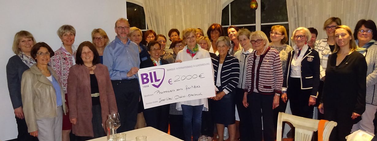 Récemment la présidente de l'Inner Wheel Diekirch-Ettelbruck,Marielle Streng , entourée des membres de son club, a remis un chèque de 2000€ au Président de Pharmaciens sans frontières, Monsieur Camille Groos.