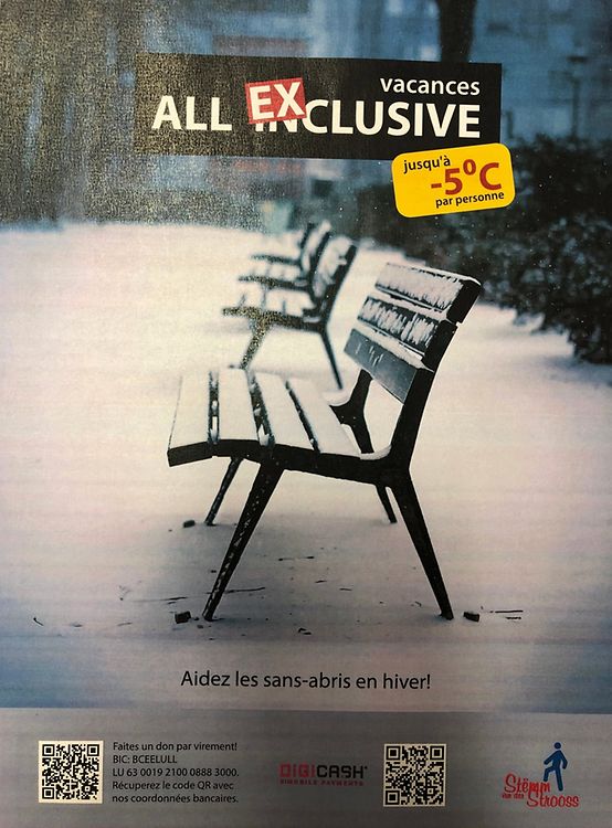 Chaque hiver et pour la troisième année consécutive, la société "The Loupe" de Vianden crée une affiche pour la Stëmm vun der Strooss dans le but d'attirer l'attention sur le problème des personnes sans abri et des personnes dans le besoin au Luxembourg. Il s'agit d'un travail bénévole conçu par Tetyana Karpenko, visant à aider la Stëmm vun der Strooss à lever plus d'argent pour combattre des problèmes urgents.