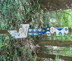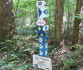 Rekordverdächtig? Eine Menge Schilder, Pfeile, Hinweise an Holzpfahl