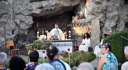 Liichterprëssioun a Festmass bei der Lourdes- Grotte zu Viichten