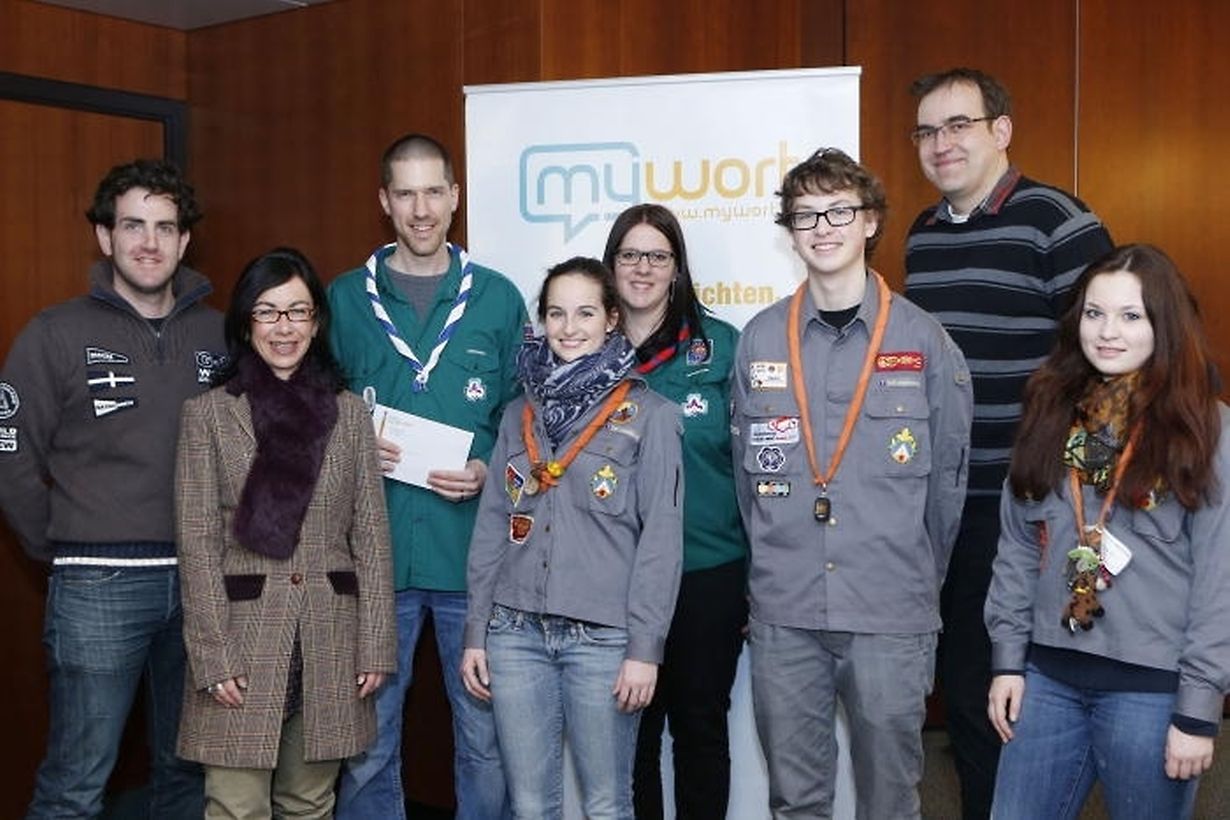 Einer sechsköpfigen Delegation der beiden Gruppen wurde am Donnerstag der Hauptgewinn aus den Händen der Leiterin der Saint-Paul Marketing-Abteilung Christiane Bram überreicht. Es handelte sich dabei um einen Einkaufsgutschein beim lokalen Fleischermeister im Wert von 200 Euro. Anschließend besuchten die Pfadfinder die Studios von Radio DNR in denen Jill Kohl (FNEL) und Sven Linckels (LGS) auch gleich an einer Live-mywort-Sendung teilnehmen durften um ihre beiden Gruppen kurz vorzustellen. Den Siegerbeitrag mit Video finden Sie auf www.mywort.lu/bb-lorentzweiler
