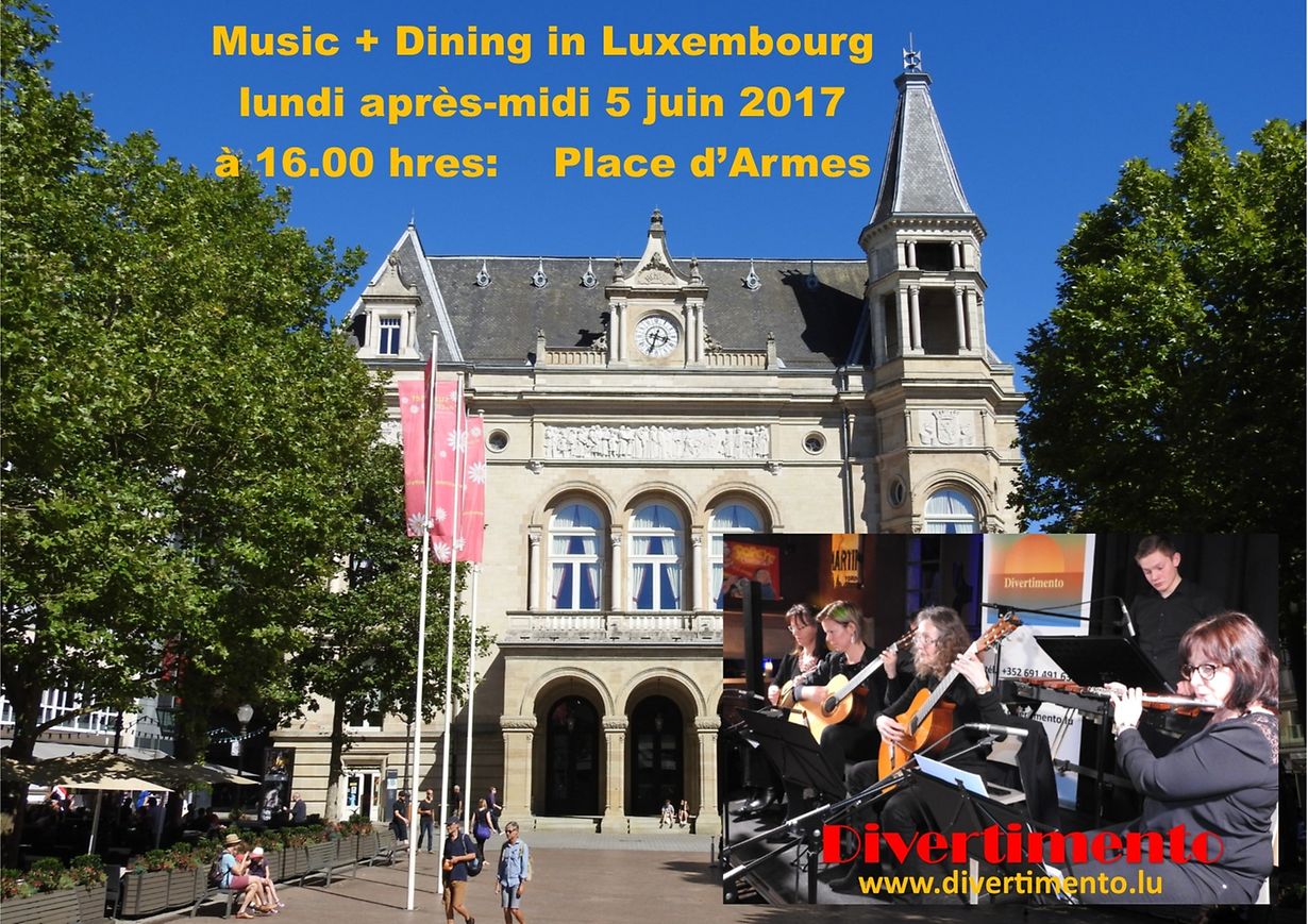 Am Pfingstmontag, den 5. Juni 2017 um 16.00 Uhr, spielt Divertimento unter der Leitung von Isabelle Merlevede zu einem Konzert auf der Place d'Armes in Luxemburg-Stadt auf. Ein abwechslungreiches Programm mit anspruchsvollen Melodien aus Rock und Pop bis hin zu latein-amerikanischen Melodien erwartet sie.
