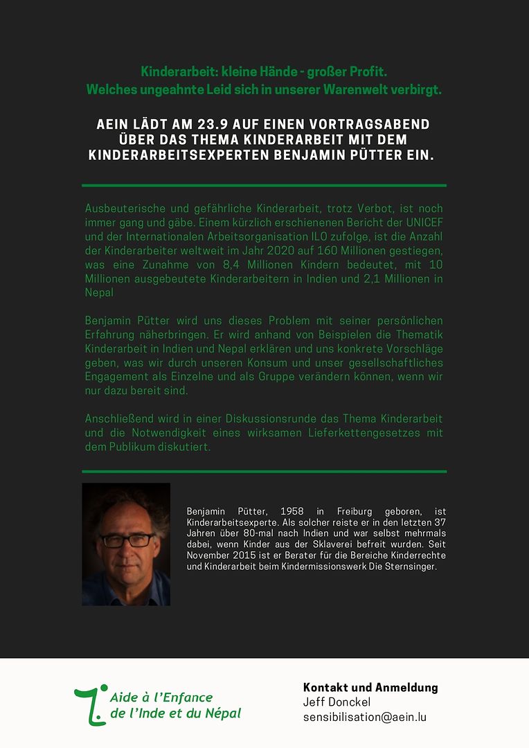 AEIN lädt am 23.9 auf einen Vortragsabend über das Thema Kinderarbeit mit dem Kinderarbeitsexperten Benjamin Pütter ein.