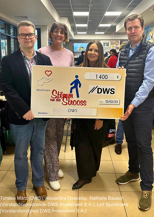 L’entreprise de fonds d’investissement DWS a récemment offert des chèques-repas d’une valeur de 1400 € à la Stëmm vun der Strooss. Sous l’initiative de leur administrateur-délégué Nathalie Bausch et la coordination de son assistant Torsten März, les employés de DWS ont eu la possibilité de faire don de leurs chèques-repas.