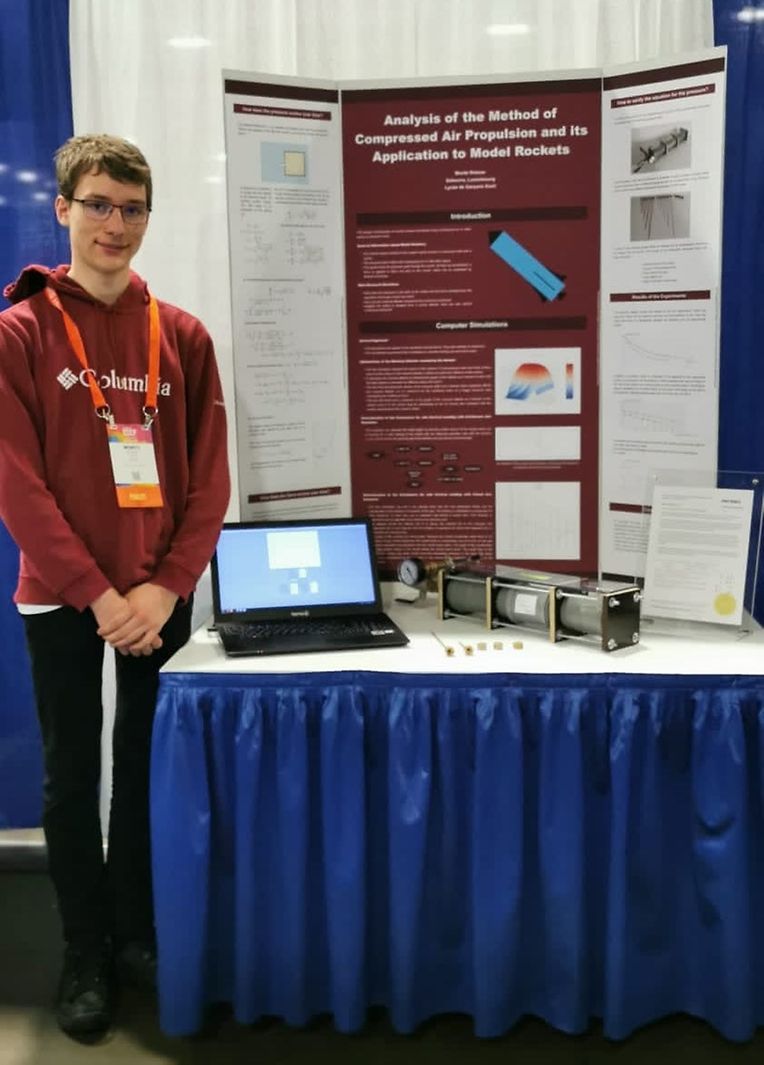 Avec son projet en physique « Compressed Air Propulsion and Model Rockets » (https://www.youtube.com/watch?v=g_OW1_N01ZM), Moritz (16 ans), du Lycée de Garçons de Esch, a étudié théoriquement, numériquement et expérimentalement la poussée d’une fusée à air comprimé, notamment dans l’objectif d’atteindre un atterrissage vertical.