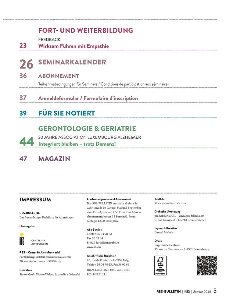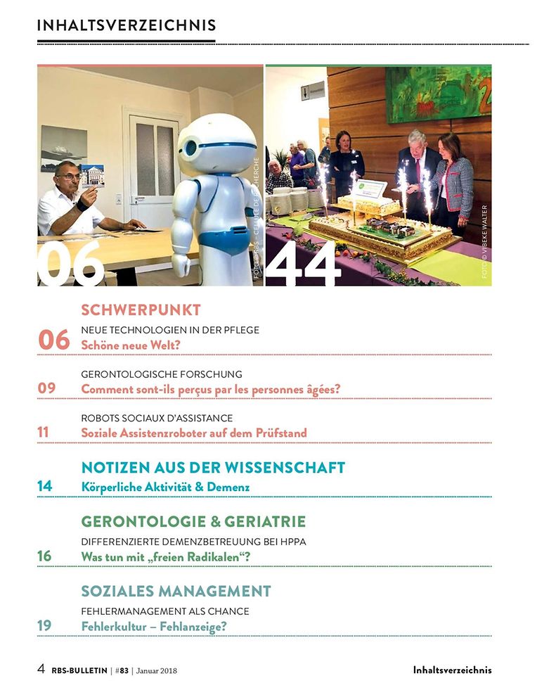 Die neue Ausgabe des Luxemburger Fachblatts für Altersfragen ist da. Das Magazin greift aktuelle Themen der Pflege auf. Es erscheint mit einer Auflage von 1500 Exemplaren dreimal im Jahr und richtet sich an Führungskräfte und Mitarbeiter in der professionellen Altenhilfe. Das Fachblatt veröffentlicht Artikel und Interviews zu aktuellen Tendenzen der luxemburgischen und europäischen Alten-, Pflege- und Sozialpolitik sowie Beiträge aus den Sachbereichen Gerontologie, Geriatrie und Sozialmanagement. Im Fortbildungskalender des Magazins werden die aktuelle Übersicht und Anmeldeformulare zu Veranstaltungen und Seminaren präsentiert. Die Januarausgabe bietet den Lesern u.a. einen interessanten Überblick zum Einsatz neuer Technologien in der Altenhilfe. Weitere Themen finden Sie im Inhaltsverzeichnis.