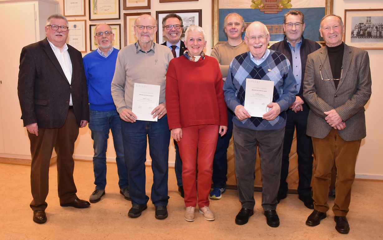 Duerno huet de Romain Henrion, Delegéierte vun der UGDA, dës Medaillen iwwerreecht: fir 20 Joer, d’Médaille du Mérite en argent, un d’Häre Charel Hemmer an Tun Wagner, a fir 60 Joer d’Médaille en vermeil Grand-Duc Adolphe, un de Jang Zeimet, deen deen Owend awer leider net konnt present sinn.