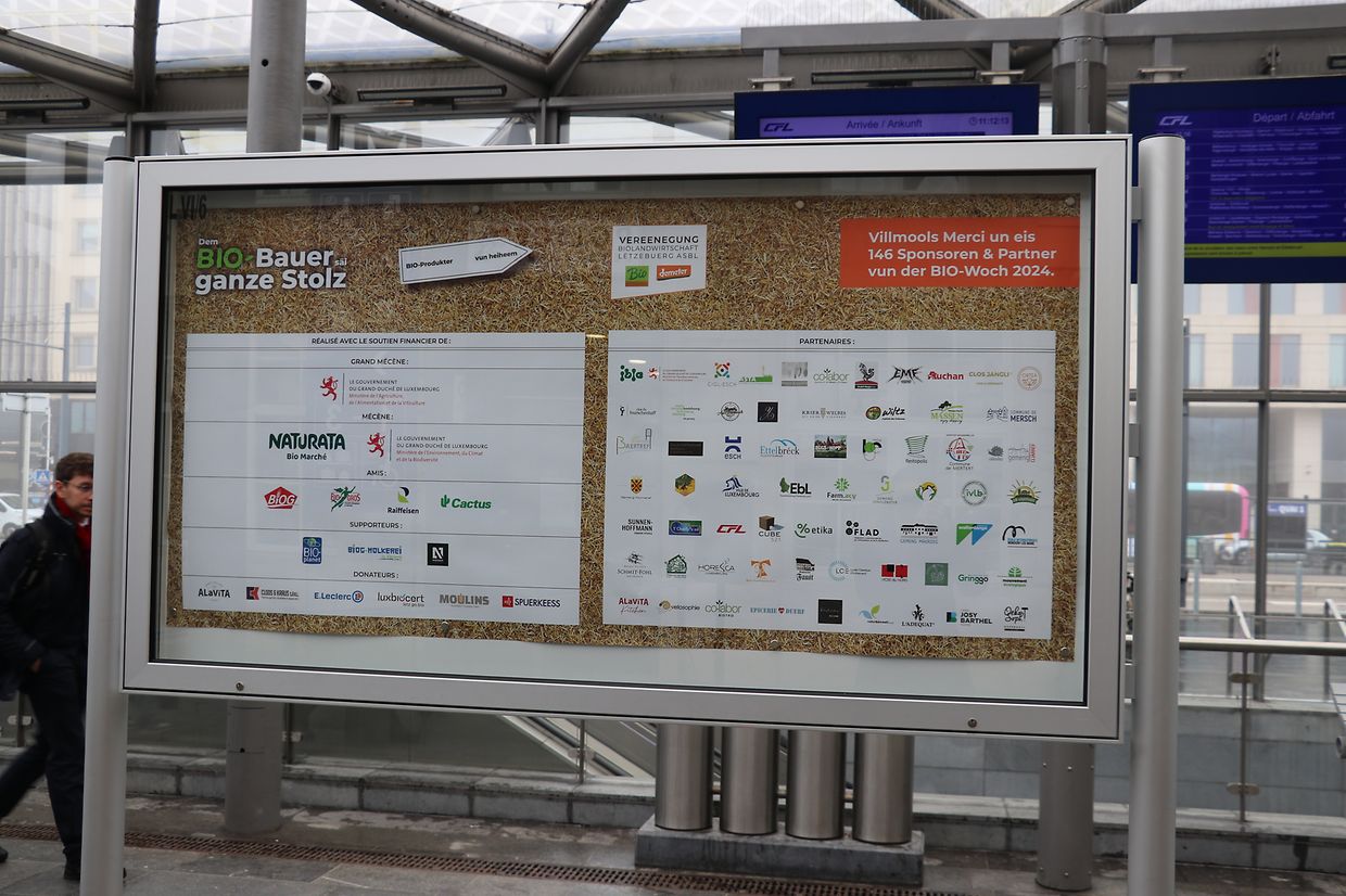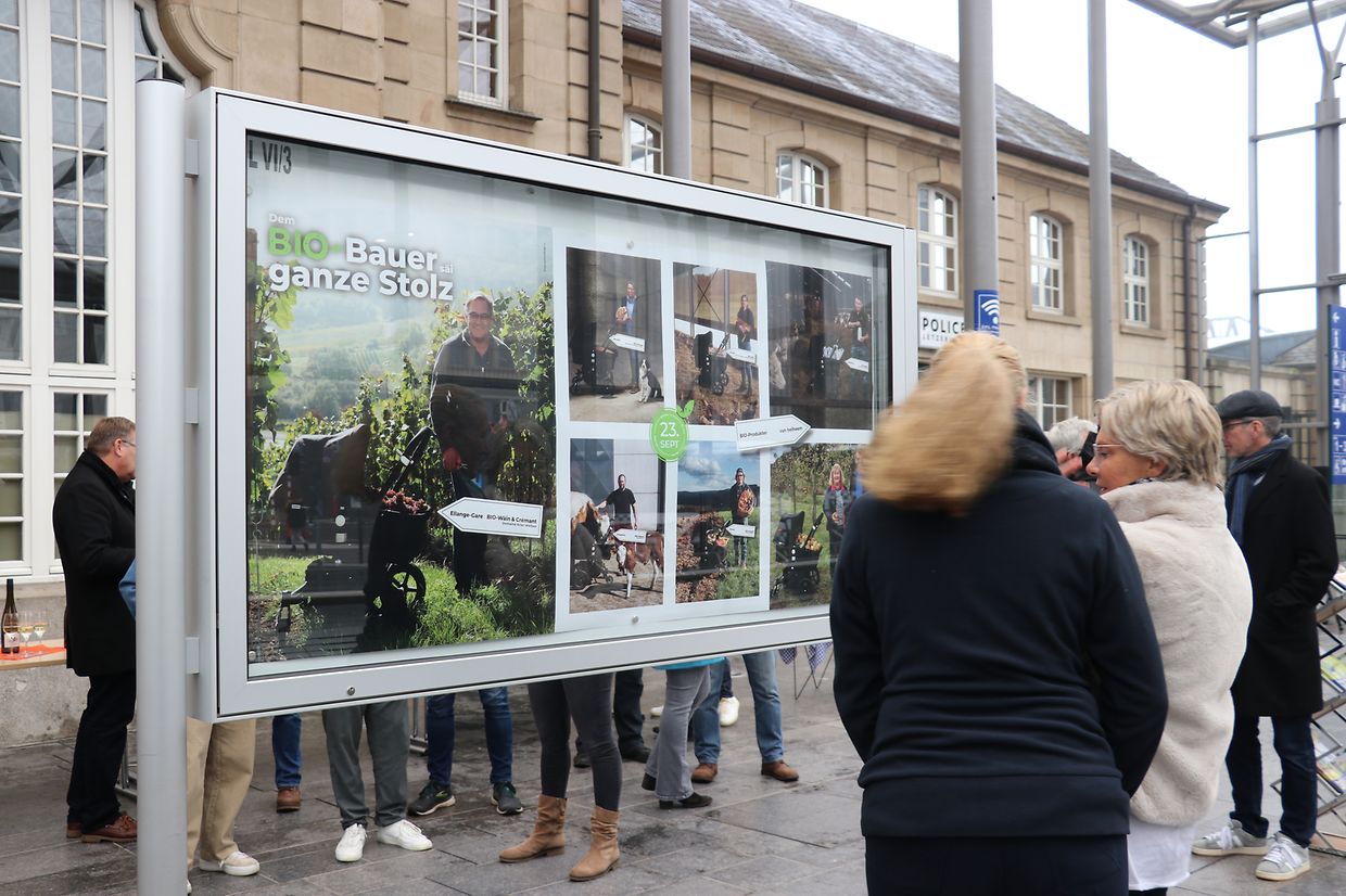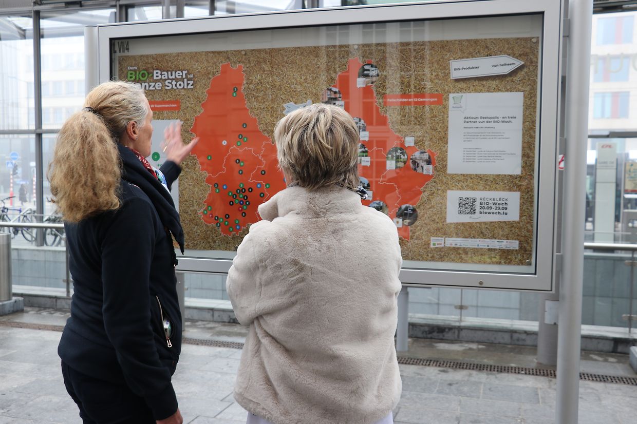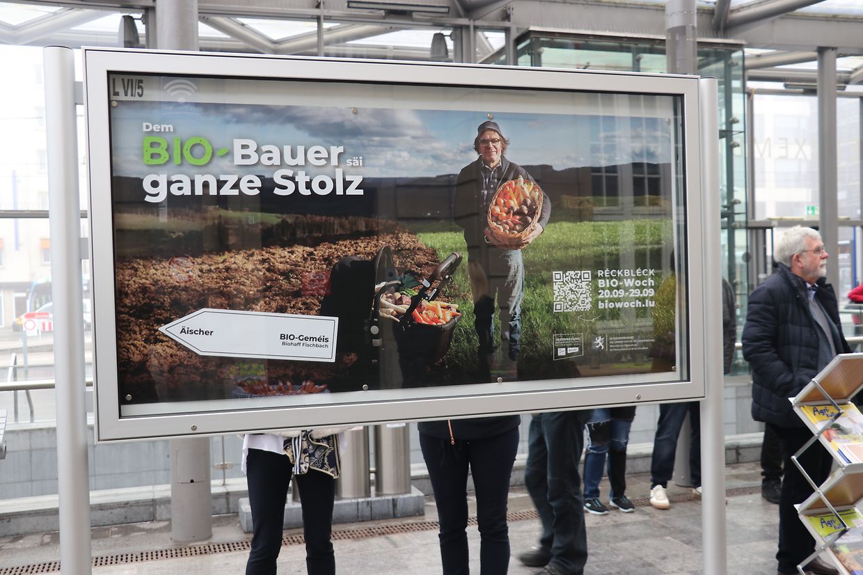 Im Beisein von Landwirtschaftsministerin Martine Hansen, mit deren Unterstützung die Vereenegung fir Biolandwirtschaft Lëtzebuerg a.s.b.l. im September die 2. BIO Woch „Dem Bio-Bauer säi ganze Stolz“ organisiert hat, wurde die „Throwback-BIO-Woch-Ausstellung“ eröffnet. In der Verrière im Bahnhof der Stadt Luxemburg, bereitgestellt von der CFL, ist den ganzen November ein Fotorückblick auf die diesjährige BIO Woch zu sehen. Die Eröffnungsfeier nutzte die Biovereenegung nicht nur um auf die BIO Woch im September zurückzublicken, sondern auch um allen Sponsoren und Mitwirkenden an der BIO Woch ein großes Dankeschön auszusprechen. Daniela Noesen von der Biovereenegung betonte, dass die Biolandwirtschaft ein nicht wegzudenkender Bestandteil Luxemburgs sei, deren Leistungen für die Natur und damit für die Gesellschaft so wertvoll seien, dass man sie immer wieder hervorheben müsse. Die BIO Woch sei dazu bestens geeignet. Denn Bio ist ein Genuss für Mensch und Natur.“ Sie dankte allen Teilnehmern, die die BIO Woch mit Leben gefüllt hätten und auch allen Sponsoren, da solch ein Event „nicht von alleine geht“. Martine Hansen bestätigte in ihrer Rede, dass die Entwicklung der Biolandwirtschaft auf einem guten Weg sei und dass das Landwirtschaftsministerium die BIO Woch auch in Zukunft finanziell unterstützen werde. Damit ist nach der BIO Woch vor der BIO Woch. Vielen Dank „e knackege Merci“ und bis spätestens nächstes Jahr.