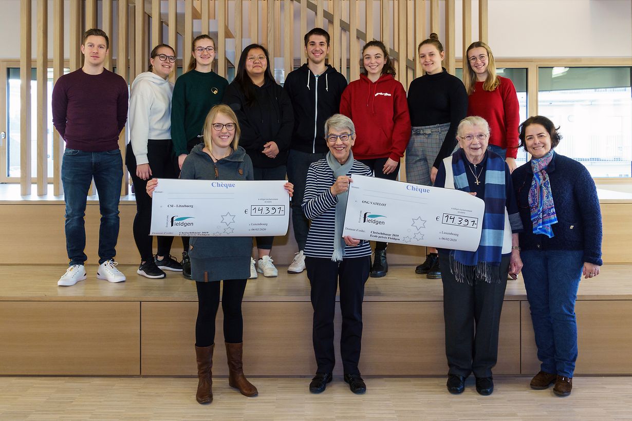 Am Samstag, den 14. Dezember war es wieder so weit: Die Ecole Privée Fieldgen organisierte ihren traditionellen Weihnachtsbazar. Trotz des sehr durchwachsenen Wetters hatten wieder zahlreiche Menschen den Weg zum Fieldgen gefunden, wo von Dekoartikeln über gestrickte Schals und gebastelte Karten eine breite Palette an Produkten angeboten wurde. Wie es sich für einen Weihnachtsmarkt gehört, durften auch Stände mit Glühwein und Essen nicht fehlen. Bei den zahlreich erschienenen Gästen kam das breitgefächerte Angebot wieder einmal gut an. Der Erlös aus dem Verkauf wurde zwischen 2 gemeinnützigen Organisationen aufgeteilt, die jeweils 14.391 € erhielten. Die ONG Vatelot wird die Spende in Kisangani im Kongo investieren, wo zwei neue Schulklassen gebaut und ausgestattet werden. Die ONG CSI Lëtzebuerg wird das Geld ebenfalls für die Bildung benachteiligter Kinder und Jugendlicher ausgeben. Am 6. Februar fand die Schecküberreichung in der Bibliothek der Schule statt. Die ONG Vatelot und CSI Lëtzebuerg nutzten die Gelegenheit, um sich recht herzlich für diese großzügige Spende zu bedanken.