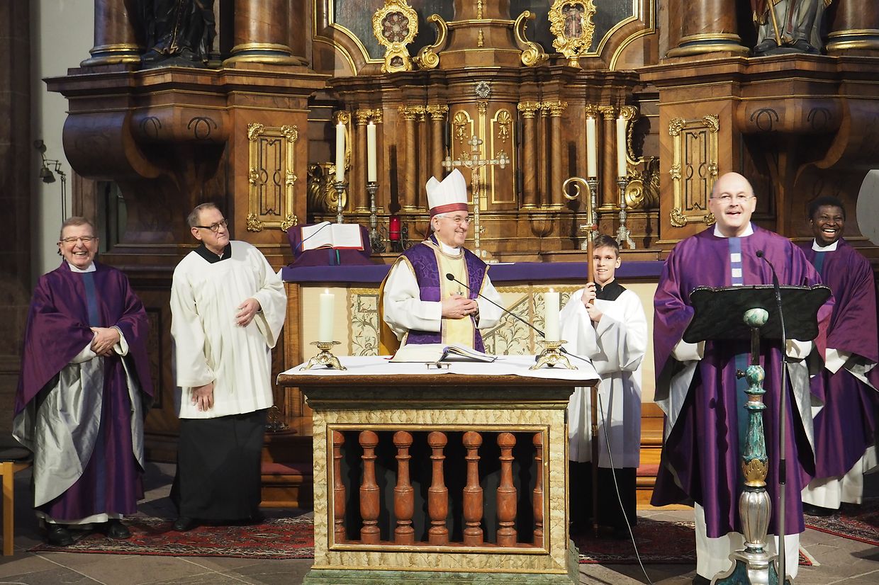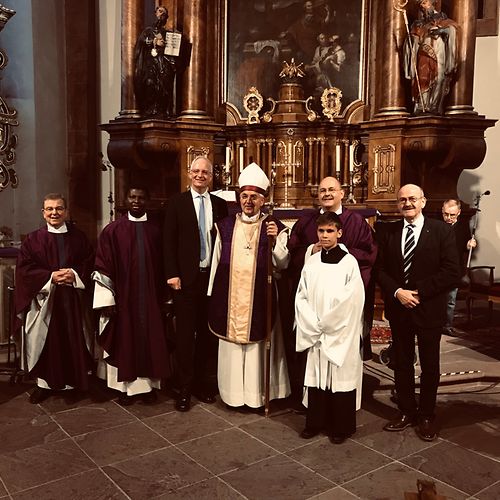 Fotos: Unter dem wachen Blick des europäischen Heiligen Pierre Fourier : Der Trierer Weihbischof Franz-Josef Gebert und Triers Oberbürgermeister Wolfram Leibe mit einem Teil der Festgäste aus Luxemburg, Deutschland und Ghana in der Trierer Welschnonnenkirche.