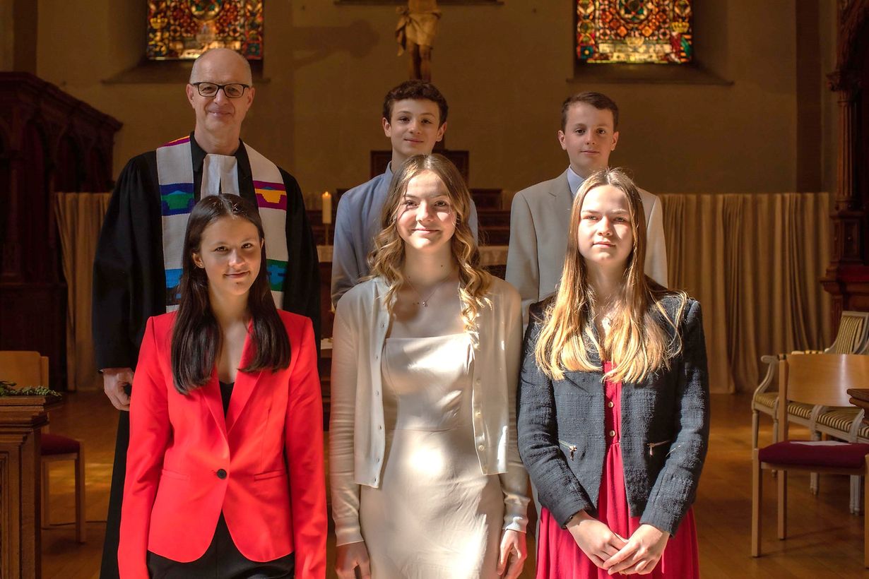 In der Dreifaltigkeitskirche wurde am Pfingstsonntag, 28.5.2023 die diesjährige Konfirmation gefeiert. Zwei Jungen und drei Mädchen wurden nach ihrer Konfirmandenzeit im Bund mit Gott durch die Taufe von Pfarrer Volker Beba bestätigt und gesegnet: Lova Feige, Daniel Liberge, Lea Michelis, Amelie Natusch und Tristan Wolf. Die Konfirmanden gestalteten die Gottesdienstliturgie mit und teilten das heilige Abendmahl aus. Die Präsidentin des Konsistoriums Emmanuelle Bauer begrüsste die Konfirmierten als erwachsene Mitglieder der Gemeinde.