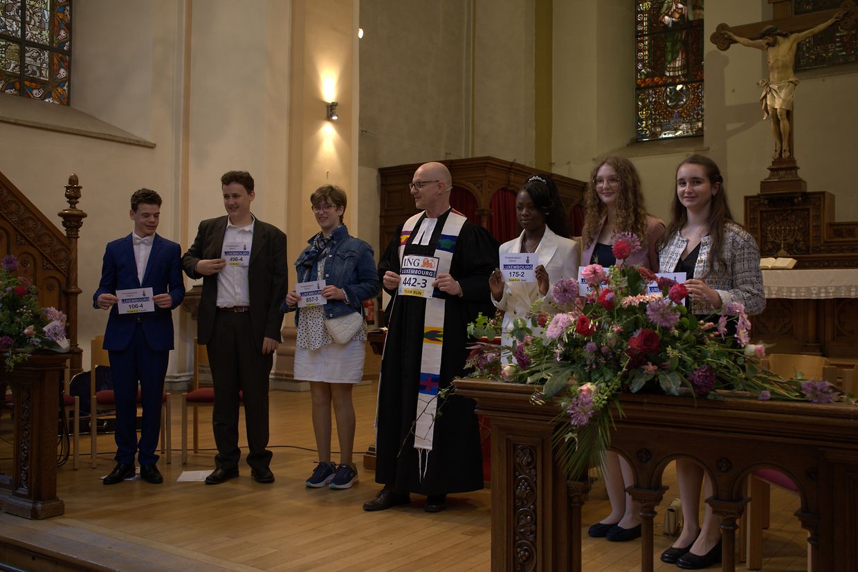 Am Pfingstsonntag, den 19. Mai 2024, fand in der Dreifaltigkeitskirche in Luxemburg-Stadt der diesjährige Konfirmationsgottesdienst der Protestantesch Kierch vu Lëtzebuerg statt. 2 Jungen und 4 Mädchen hatten sich ein Jahr lang vorbereitet und wurden im Bund Gottes durch die Taufe von Pfarrer Volker Beba konfirmiert: Sédi Afeto, Tassilo Jaeger-Merinheiro, Leo Langen, Célia Marsot, Léa Prüm und Stella Plonus.