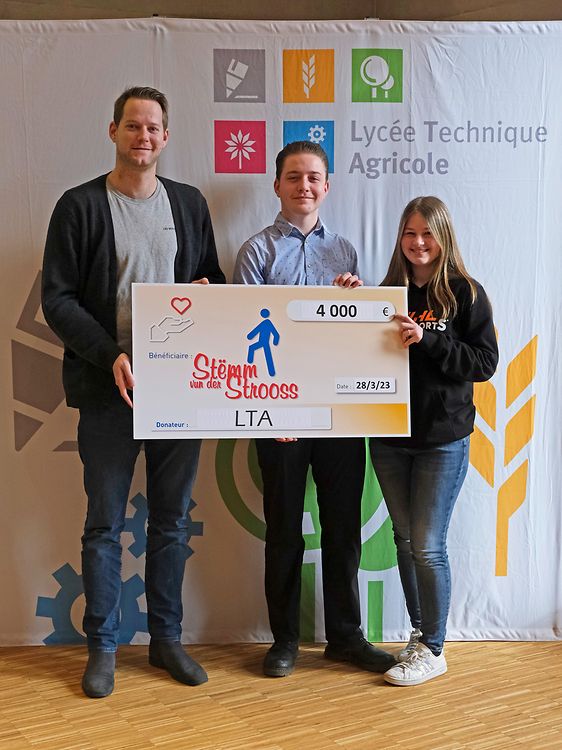 Le Lycée Technique Agricole Gilsdorf contribue aux projets de la Stëmm vun der Strooss. Représentée par Romain Tobes, directeur adjoint du LTA, et Manon Roemen, attachée à la direction, le lycée a remis le mardi 27 mars 2023 un chèque d’une valeur de 4 000 € à Bob Ritz, chargé de communication auprès de la Stëmm.
