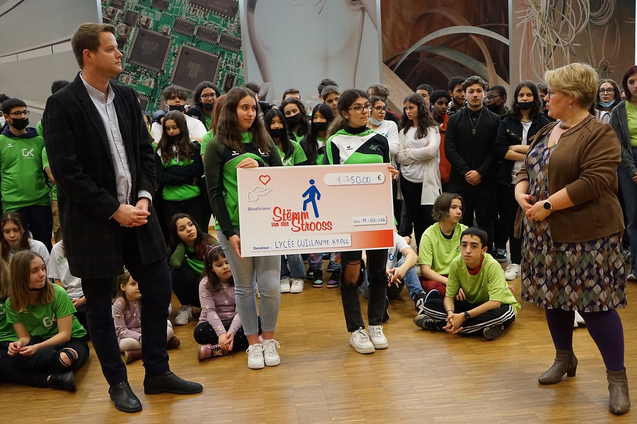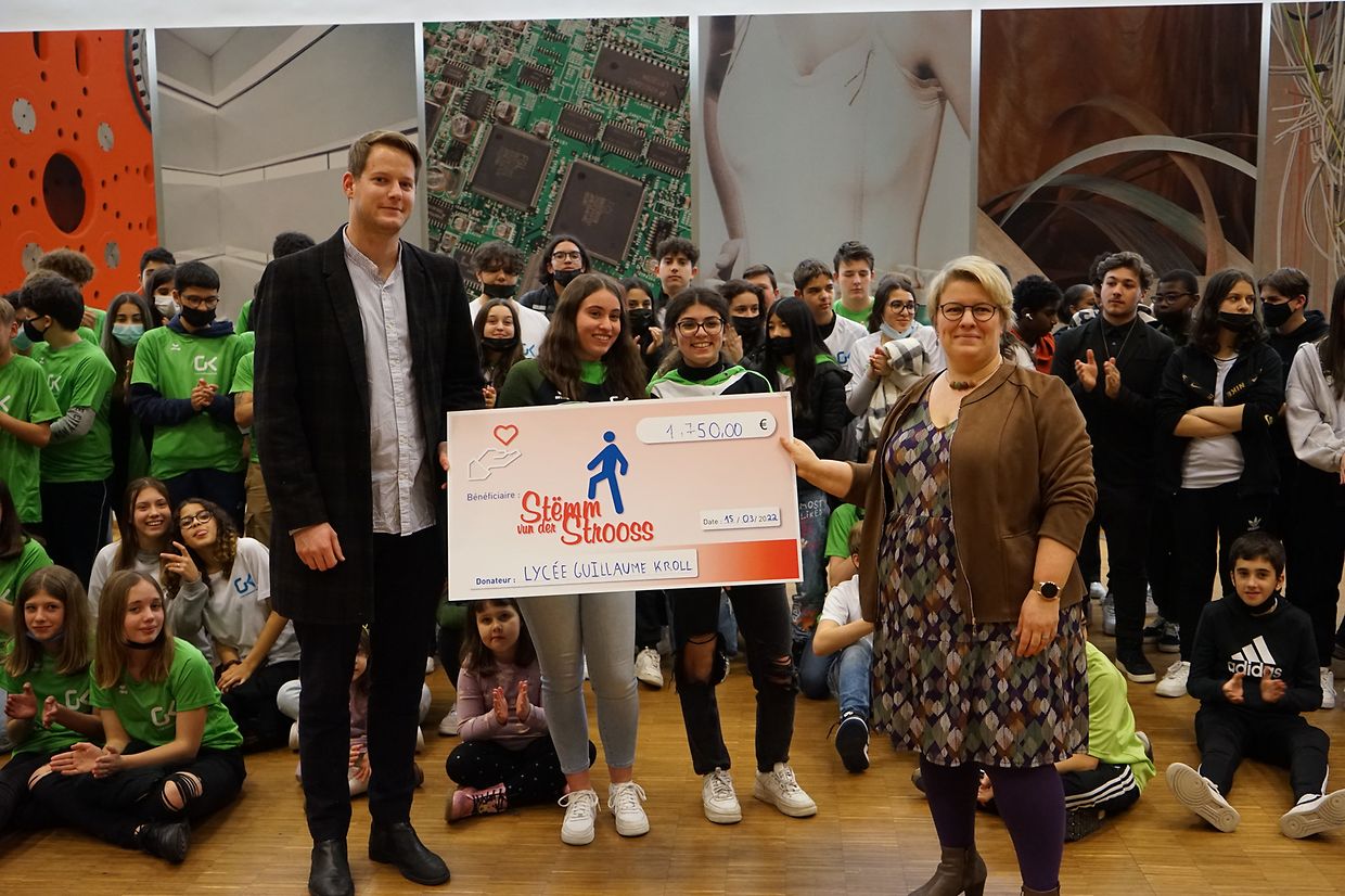 Le Lycée Guillaume Kroll à Esch-sur-Alzette a remis, le mardi 15 mars, un chèque d’une valeur de 1 750€ à Bob Ritz, chargé de communication à la Stëmm vun der Strooss. La direction du lycée, représentée par le directeur adjoint, Bertrand Goergen, et l’attachée à la direction, Marie Degée, a expliqué que cette belle somme a été récoltée lors de la traditionnelle fête de Noël du lycée, qui a connu un grand succès, notamment grâce à l`énorme engagement des élèves.