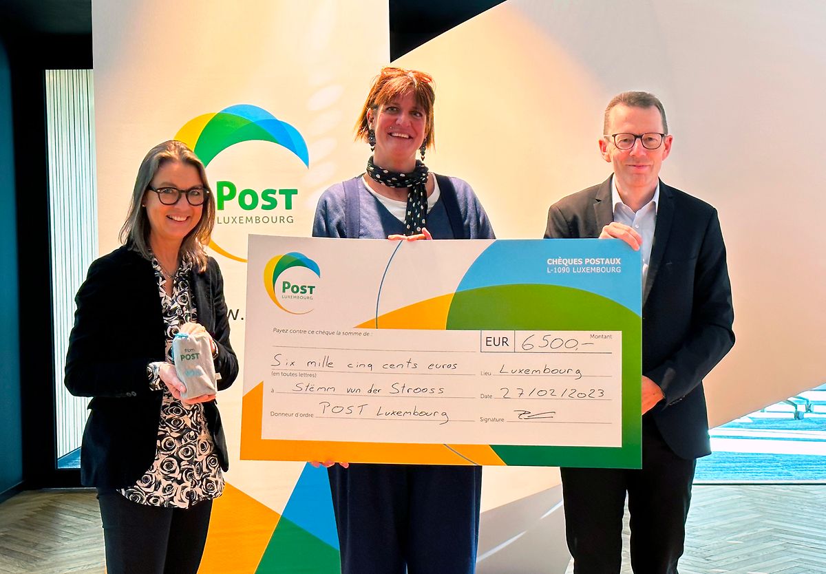 Ainsi, Pierre Zimmer, directeur général adjoint de POST Luxembourg et Isabelle Faber, Directrice Ressources humaines, Relations publiques & RSE de POST Luxembourg ont remis un chèque d’une valeur totale de 6 500 € à Alexandra Oxacelay, la directrice de la Stëmm vun der Strooss, le lundi 27 février 2023 lors d’une remise de don officielle dans le siège de POST Luxembourg.