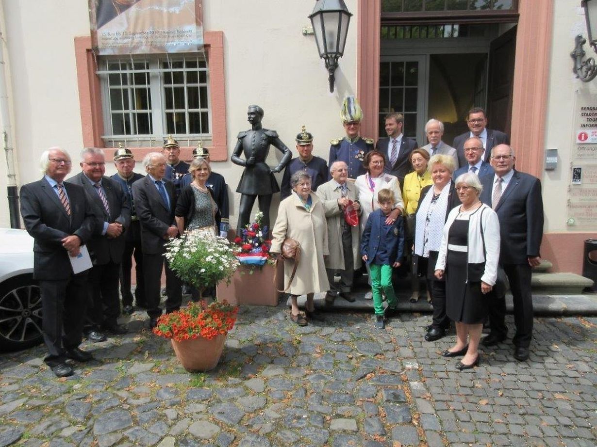 Bei strahlendem Sonnenschein fand kürzlich die Luxemburger Nationalfeier des Luxemburger-Freundeskreises Rhein-Main e.V. (LFRM) in Weilburg an der Lahn statt, der ehemaligen nassauischen Residenz des heutigen Großherzoglichen Hauses Luxemburg-Nassau. Seit dem Jahre 1979, als der LFRM erstmals die Nationalfeier in Weilburg ausrichtete, war es diesjährig das 15. Mal, dass der offizielle Geburtstag des S.K.H. Großherzogs in Weilburg begangen wurde. Nach dem Gottesdienst fand auf dem Schlossplatz vor dem im Februar 2012 vom Großherzog und der Großherzogin enthüllten Standbild Herzog Adolphs zu Nassau eine Gedenkzeremonie statt. In Anwesenheit der Weilburger und Biebricher Autoritäten war die Weilburger Bürgergarde zu beiden Seiten des Denkmals angetreten. LFRM-Präsidentin Elise Fink-Weydert und LFRM-Ehrenpräsident Pierre Even legten zu Füssen des Standbilds ein Blumengebinde in luxemburgischen Farben nieder. Ein Gruppenfoto aller anwesenden Luxemburger und Gäste beidseits des Monuments beschloss die Gedenkzeremonie. Danach lud der LFRM im Hotel-Restaurant „Lahnschleife“ zu einem Aperitif und einem in den Nationalfarben geschmückten Festessen für 24 Personen ein. Ihre hierbei gehaltene Ansprache beschloss die Präsidentin mit einem dreifachen „Vive“ auf den Großherzog, die großherzogliche Familie und unsere Heemecht.