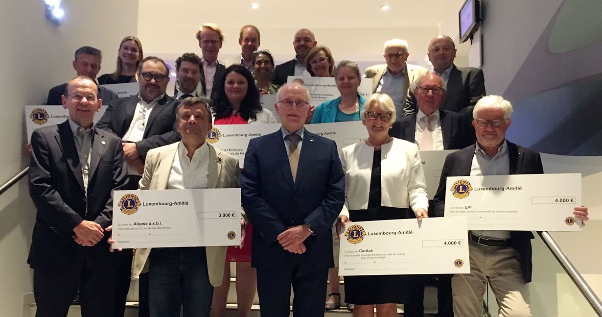 Le Lions Club Luxembourg - Amitié vient de remettre leurs chèques respectifs aux associations qu’il a choisi de faire bénéficier du produit de ses actions sociales couvrant l’exercice 2017/2018.Cette année a été particulièrement propice, puisqu’au total 40.000 € ont pu être transmis à onze associations caritatives différentes. Les projets ou programmes bénéficiaires sont de nature multiple, visant e.a. des besoins éducatifs, alimentaires et médicaux aussi bien dans des pays en voie de développement qu’au Luxembourg même. Les entités retenues sont: Aide à l’enfance de l’Inde et du Népal, Alupse (Association luxembourgeoise de pédiatrie sociale), Caritas, Coup de pouce (Congo), EPI (Association Encouragement Promotion Intégration), Le Luxembourg se mobilise pour la Centrafrique, Oekologeschen Zentrum fir Gardebau, Partage Luxembourg(Kenya), Pour un sourire d’enfant (Cambodge), Reech eng Hand Bartreng, sparkles.lu. Le Lions Club Luxembourg-Amitié est un des 24 Lions Clubs du Luxembourg. Il a été fondé en 1975 et compte actuellement 67 membres.