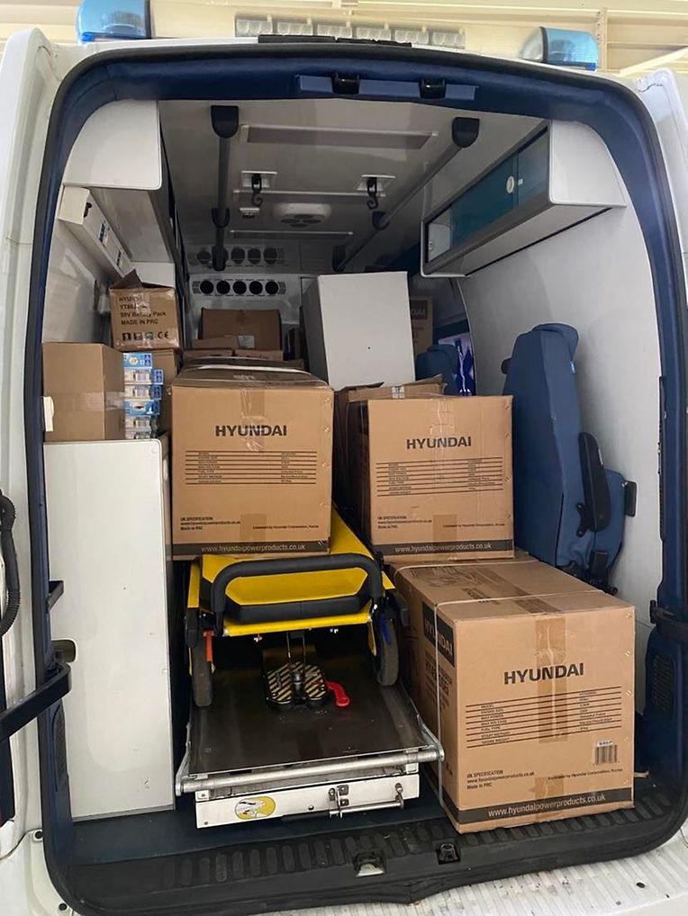 En plus de la réparation des ambulances, une aide humanitaire sous forme de bandages, de trousses médicales, d'antiseptiques et de soins aux brûlures a été rassemblée et envoyée avec les véhicules aux hôpitaux souffrant d'une grave pénurie de ces fournitures.