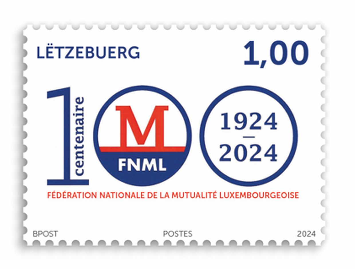 100 Jahre FNML. Die Fédération Nationale de la Mutualite Luxembourgeoise (FNML), Nationaler Verband der Mutualitätsgesellschaften wurde am 6. Juli 1924 gegründet und am 9. August 1925 vor dem Friedensgericht in Luxemburg-Stadt amtlich beurkundet. Der ursprüngliche Gedanke zur Gründung der solidarischen, auf gegenseitiger Hilfe beruhenden Gesellschaften geht auf die Mitte des 19. Jahrhunderts zurück, als es noch kein verpflichtendes allgemeines Sozialversicherungssystem gab. Die FNML vereint und vertritt die Gesamtheit der ihr angeschlossenen Mutualitätsvereine und arbeitet gemeinsame Dienste und Leistungen aus, die allen Mitgliedern der einzelnen Vereine zur Verfügung stehen. 1956 gründete die FNML die Caisse chirugicale mutualiste, die 1975, mit der Caisseomplementaire Mutualiste (CMCM) fusionierte und heutzutage die grösste Mutualitäts-Gesundheitskasse in Luxemburg ist. Nennwert: 1,00 Euro. Layout: Agence Créa POST Luxembourg. Druck: Bpost Stamps, Factory, Malines (BE).