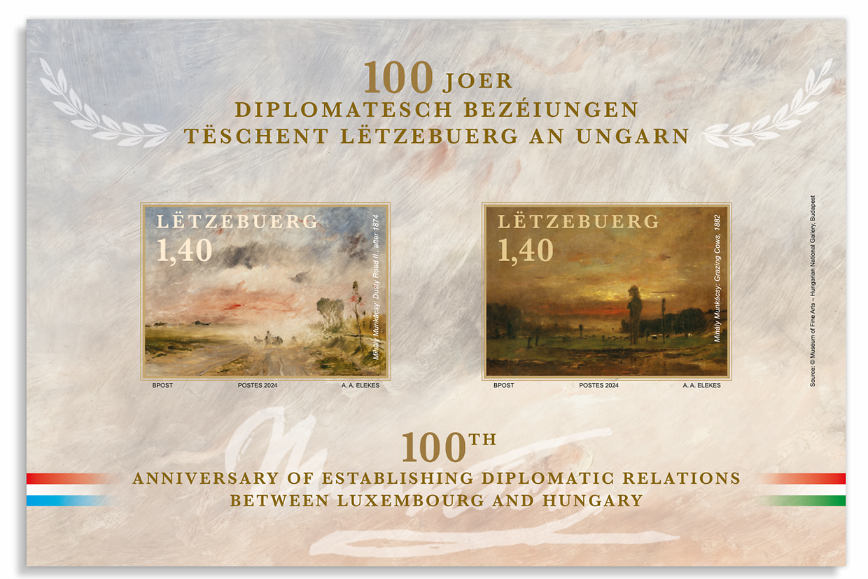 Ein Block –Gemeinschaftsausgabe mit Ungarn „100 Jahre diplomatische Beziehungen Luxemburg-Ungarn“. 2024 feiern Luxemburg und Ungarn 100 Jahre diplomatische Beziehungen. Zu diesem Anlass geben POST Philately und Magyar Post, also die ungarische Post, gemeinsam einen Block heraus. Die parlamentarische Republik Ungarn besteht aus 19 Komitaten (Gespanschaften) und der Hauptstadt Budapest. Ungarn ist seit 1999 Mitglied der NATO und seit dem 1. Mai 2004 im Zuge der EU-Osterweiterung Mitglied der Europäischen Union. Der gemeinsame Block zum Jubiläum der diplomatischen Beziehungen zeigt zwei Landschaftsgemälde von Mihaly von Munkacsy, zum einen das Motiv „Poros ut II“. (Staubige Straße II), das nach 1874 entstanden ist, und zum anderen „Legeleszö csorda“ (Weidende Kühe) Nenwert: 2,80 Euro. Layout: Attila André ELEKES (U). Druck: Bpost Stamps Factory Malines (BE).