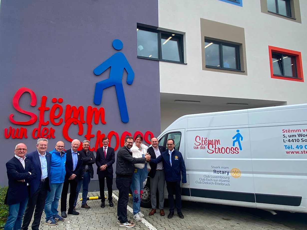Cette année, le Rotary souffle ses 95 bougies au Luxembourg. Les trois premiers clubs fondés dans le pays furent le RC Luxembourg en 1929, le RC Esch-sur-Alzette en 1960 et le RC Diekirch-Ettelbruck en 1963. En 2024, ces trois clubs ont décidé de s'unir pour agir ensemble contre la pauvreté et pour la cohésion sociale. En lançant l'action commune "Staark mam Rotary", ils ont récolté 30 000€, permettant ainsi à la Stëmm d'acquérir un nouveau fourgon. L’annonce officielle de ce don provenant à parts égales des trois Clubs a été faite le samedi 11 mai dans le hall polyvalent Aal Seeërei à Diekirch.