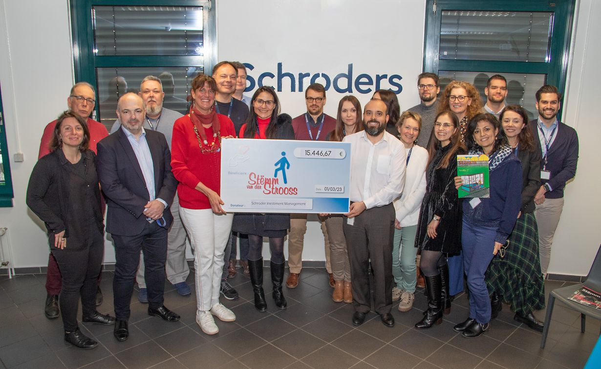 C’est sur invitation du Comité de bienfaisance de Schroder Investment Management (Europe), présidé par Madame Vanessa Grueneklee, que la directrice de la Stëmm vun der Strooss, Alexandra Oxacelay, s’est vue remettre un chèque de 15 446, 67 €.