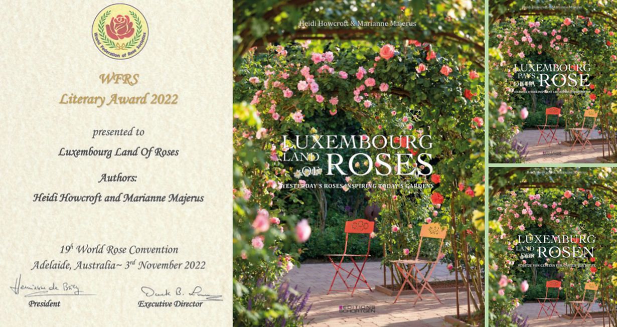 La World Federation of Rose Societies (WFRS) décerne des prix littéraires tous les quatre ans. Lors de son congrès mondial tenu en Australie en novembre 2022, la WFRS a décerné le ‘WFRS Literary Award 2022’ au recueil en trois versions linguistiques séparées ‘Luxembourg Pays de la Rose’ – ‘Luxembourg Land of Roses’ – ‘Luxemburg Land der Rosen’. Ce livre décrit une page importante de l’histoire rosière du Luxembourg et son impact national et international du XIX au XXI siècles, tout en présentant des roseraies privées et publiques du Luxembourg : un must dans chaque foyer.