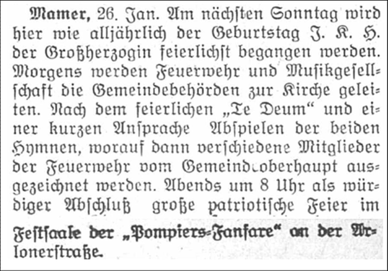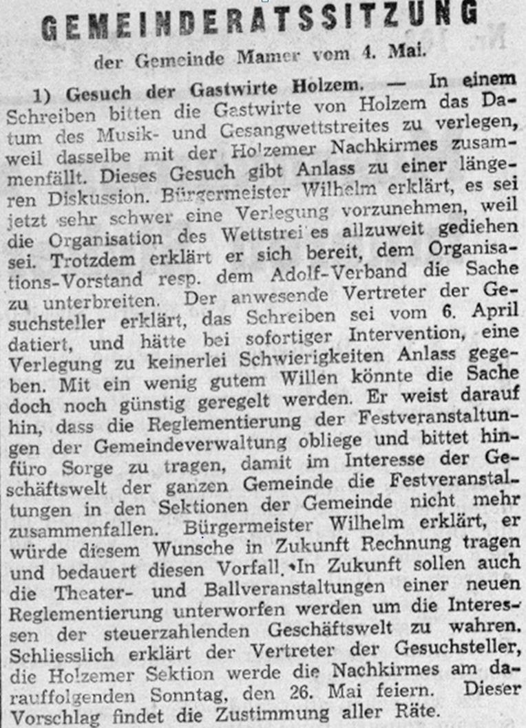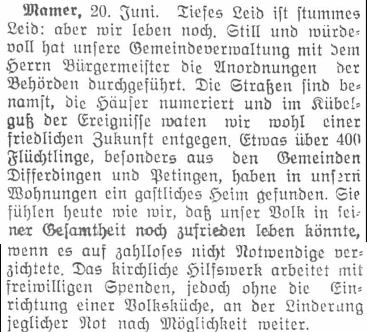 Ralph Letsch referierte dann über die Geschehnisse in der Gemeinde Mamer im ersten Halbjahr 1940: die Feiern zum Geburtstag der Großherzogin im Januar, die Gemeinderatssitzung vom 15. Februar, verschiedene Stellenangebote im Frühjahr, die Spiele des Fußball-Vereins (FC Mamer 32) und des Tisch-Tennis-Vereins, die Klassements von Jean Kirchen des Velo-Sport Mamer bei Radsportrennen, die Teilnahmen an der Oktav-Prozession, die Vorbereitungen für die Kammerwahlen vom 2. Juni, die Gemeinderatssitzung vom 4. Mai, der 1. Kriegstag, die Flüchtlinge aus der Minette-Region, das Fazit am 20. Juni in der Presse.