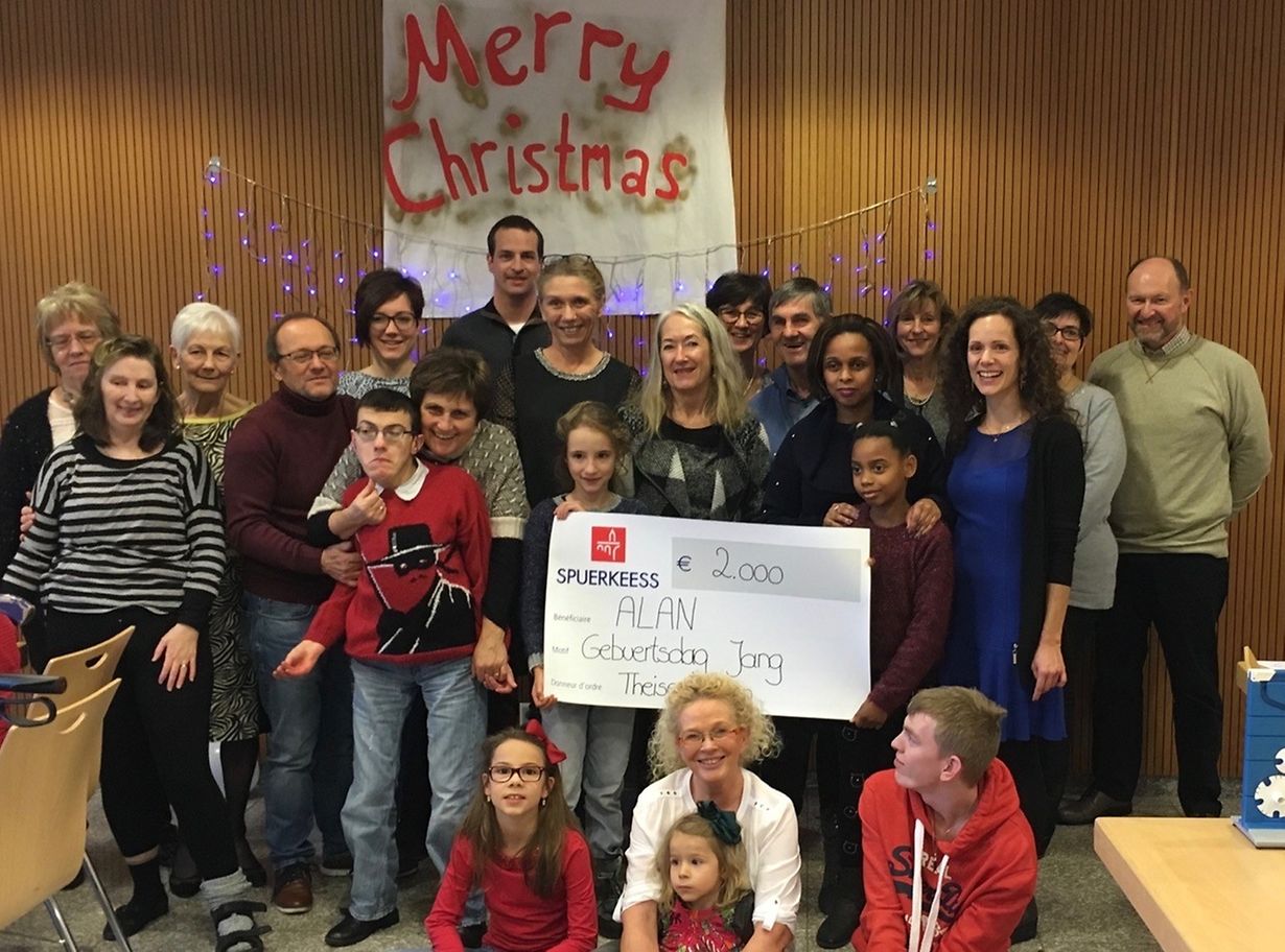 Am Kader vu sengem 65. Gebuertsdag huet den Här Theisen-Clemens Jean ee generéisen Don un d'Associatioun ALAN - Maladies Rares Luxembourg gemaach. Den Här Theisen, dee selwer vun enger seelener Krankheet betraff ass, war zesumme mat senger Famill fir d'Scheck Iwwerreeschung op der Chrëschtfeier vun der ALAN. Präsent waren d'Madame Shirley Feider-Rohen, Presidentin, een Deel vun der Equipe, Memberen a Benevolle vun der ALAN.
