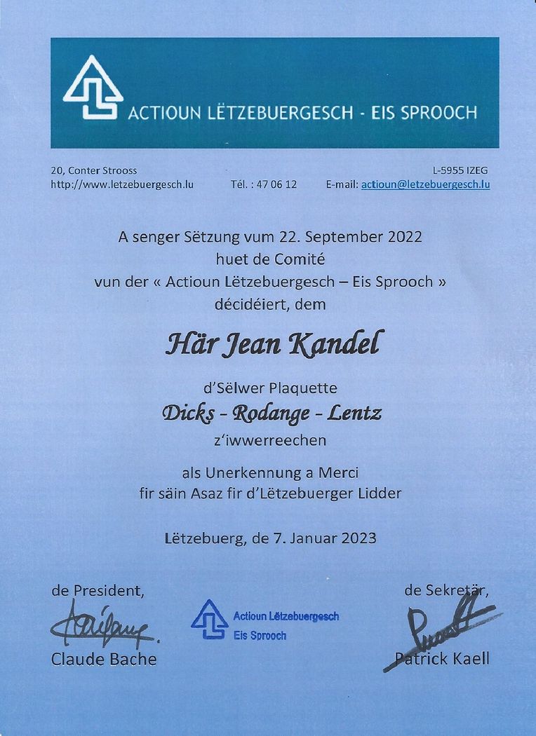 Hëlleft duerfir all, eise Lëtzebuerger Lidderschaz erëm opliewen ze loossen an ze erhalen, an de Schoulen, an de Veräiner an der Gesellschaft, an der Famill !