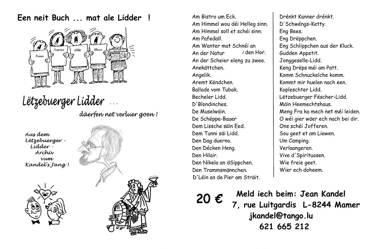 Et wier wënschenswäert däer Lëtzebuerger Lidder erëm méi ze héieren, well et gëtt der esëllechen, ganz flotter a fir jidder Geleeënheet. Ob Beruffer, Dierfer a Géigenden, weltlech- a reliéis-Fester a Festdeeg, Iessen, Drénken a Léift, Joreszäiten an Natur, Konscht an Hobby, vu fréier an haut, gudden a schlechten Zäiten, dir fannt doriwwer ee Lëtzebuerger Lidd. Duerfir, wann dir keent hutt, da besuergt iech ee Lëtzebuerger Lidderbuch, ma net fir an d'Regal oder an den Tirang, ma fir doraus ze sangen, mat Bomi a Bopi, Kanner a Kandskanner . A wann dir ee besonnescht Lidd sicht, da frot mech, villäicht ass et schonns a mengem Archiv vun ëm 4.000 Lidder a waart do op Iech !