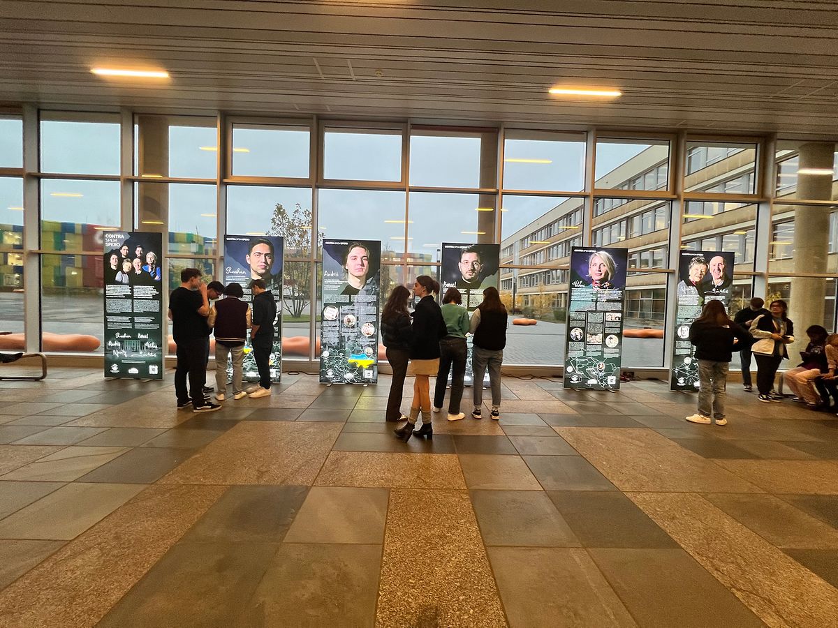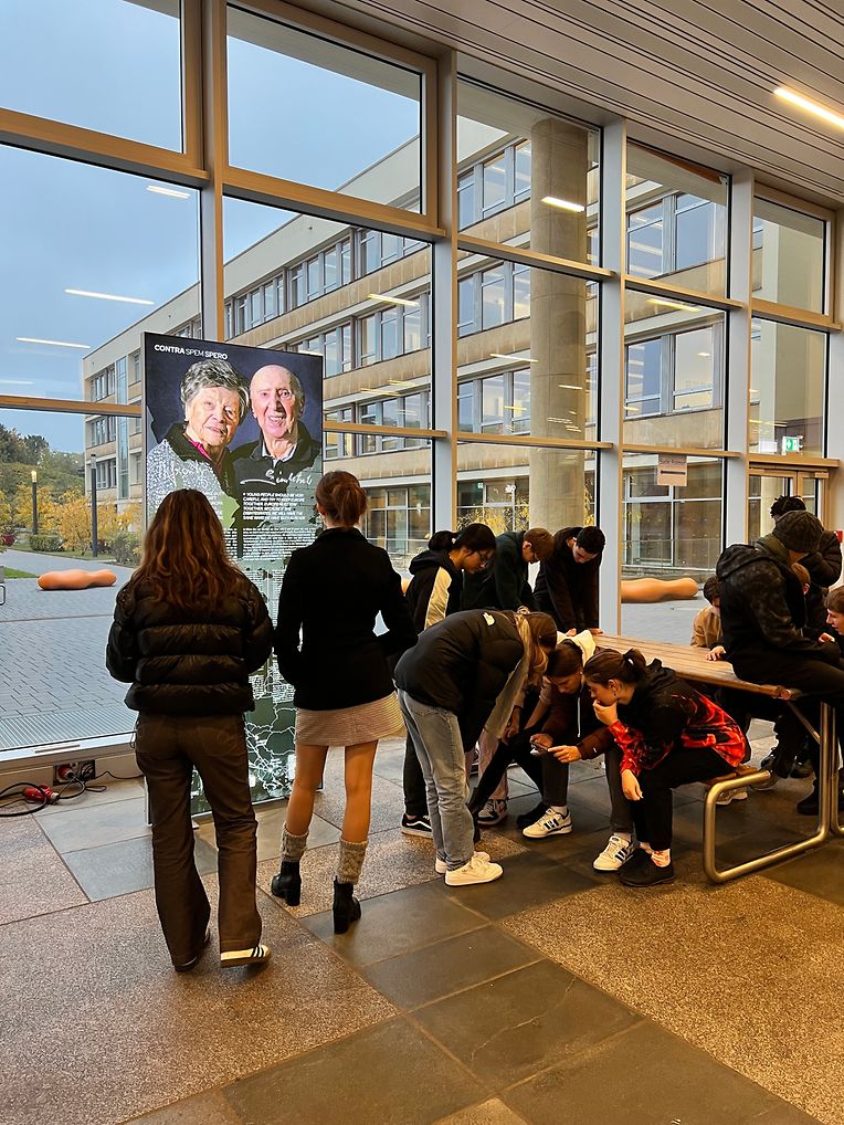 Au foyer du lycée, les élèves ont pu contempler les panneaux et télécharger l'audio avec les explications via le code QR sur leur téléphone portable.