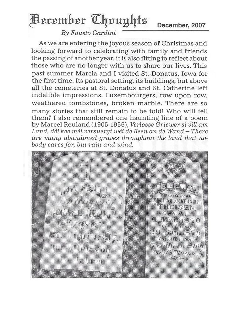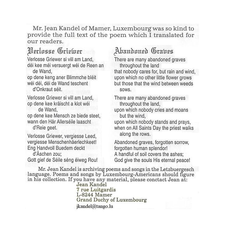 Mamer Lëtzebuerger an Amerika ! Jean Kandel 2 Bildergalerie Bitte scrollen Sie nach unten,um weitere Bilder zu sehen. Veröffentlicht am Dienstag, 3. November 2020 um 23:56 Mamer, Luxemburg Ee Gedanken zu Allerséilen fir d'Lëtzebuerger Auswanderer an Amerika... si sinn net vergiess ! Een Artikel aus der "Luxembourg News of America" vum Dezember 2007 vum Fausto Gardini. Ee Gedicht vum Marcel Reuland. Dieser Beitrag ist Teil einer mywort-Mission: Grabsteine Unpassenden Inhalt angeben Weitere Neuigkeiten von Jean Kandel > Lëtzebuerger Lidder sinn ee wichtegen Deel vun eisem "Kultuerpatrimoine" 17.11.25 Mamer Lëtzebuerger Lidder däerfen net verluer goen ! ! ! 05.11.25 Mamer Sonnenopgank iwwer Mamer... 31.10.25 Mamer Eis Lëtzebuerger Lidder sinn ee groussen Deel vun eiser Kultuer ! 04.10.25 Mamer Op d'Fouer soll ee goen wann ee Loscht huet ! 05.09.25 Mamer
