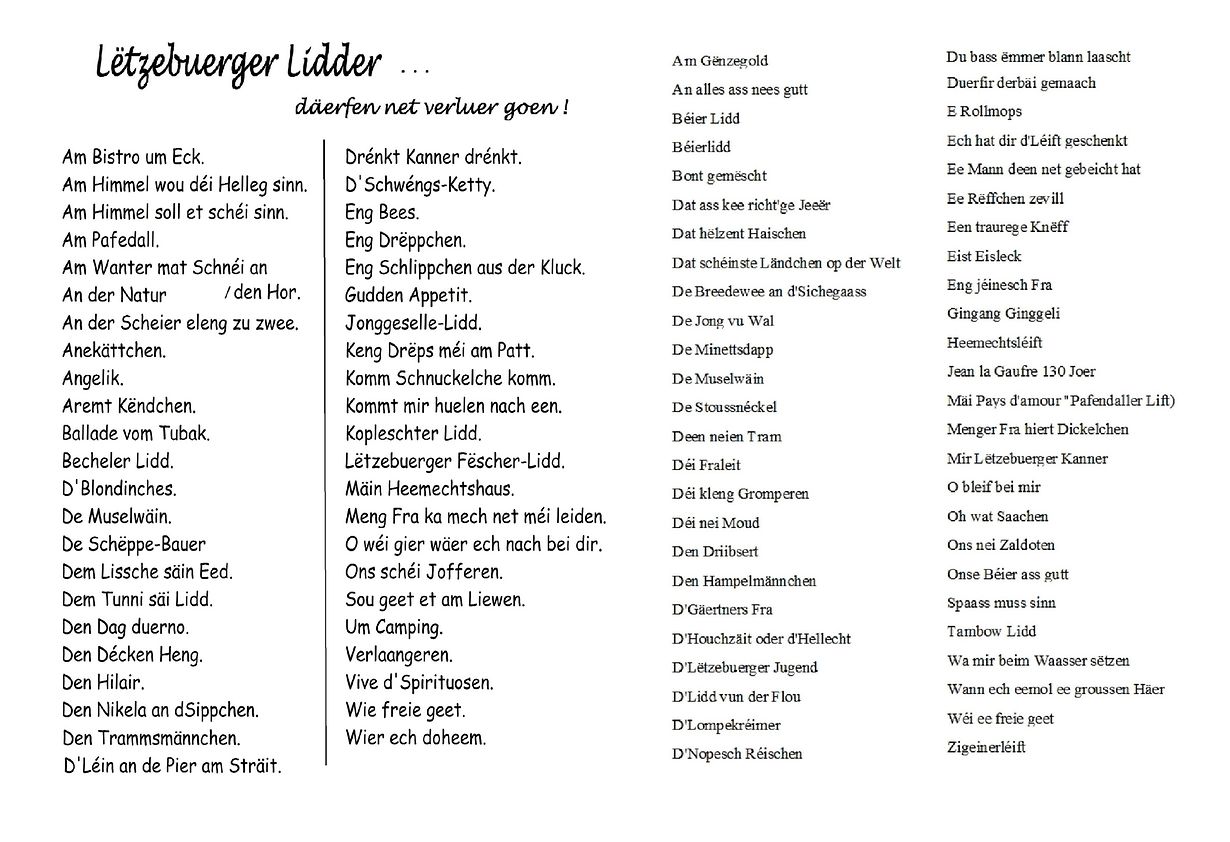Soll haut e Lëtzebuergescht Lidd gesonge ginn, da si mer séier schlecht drun. Bei der Auswiel ugefaangen, déi ass ganz bescheiden. Wann et dann ëm déi 2 oder 3 Strof geet, da musse mir meeschtens opginn! Oft sicht dir ee Lidd an dir fannt et net ! Awer villäicht a mengem Archiv vun +/- 4000 Wierker mat Wierder a Nouten !