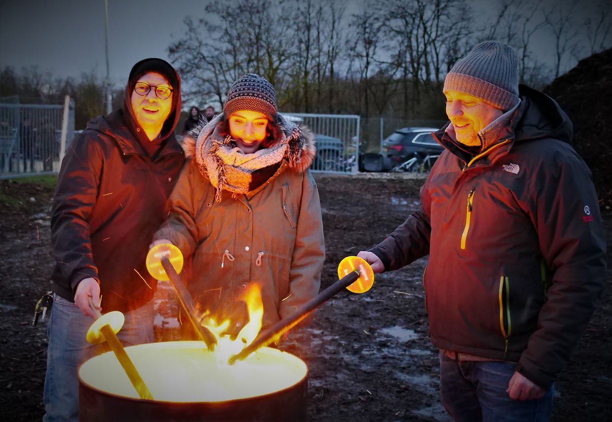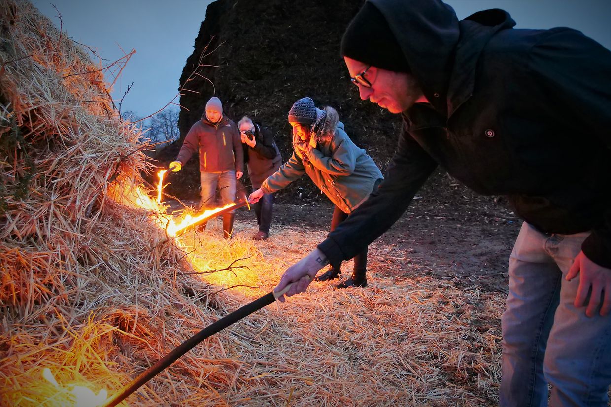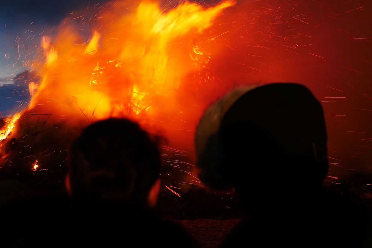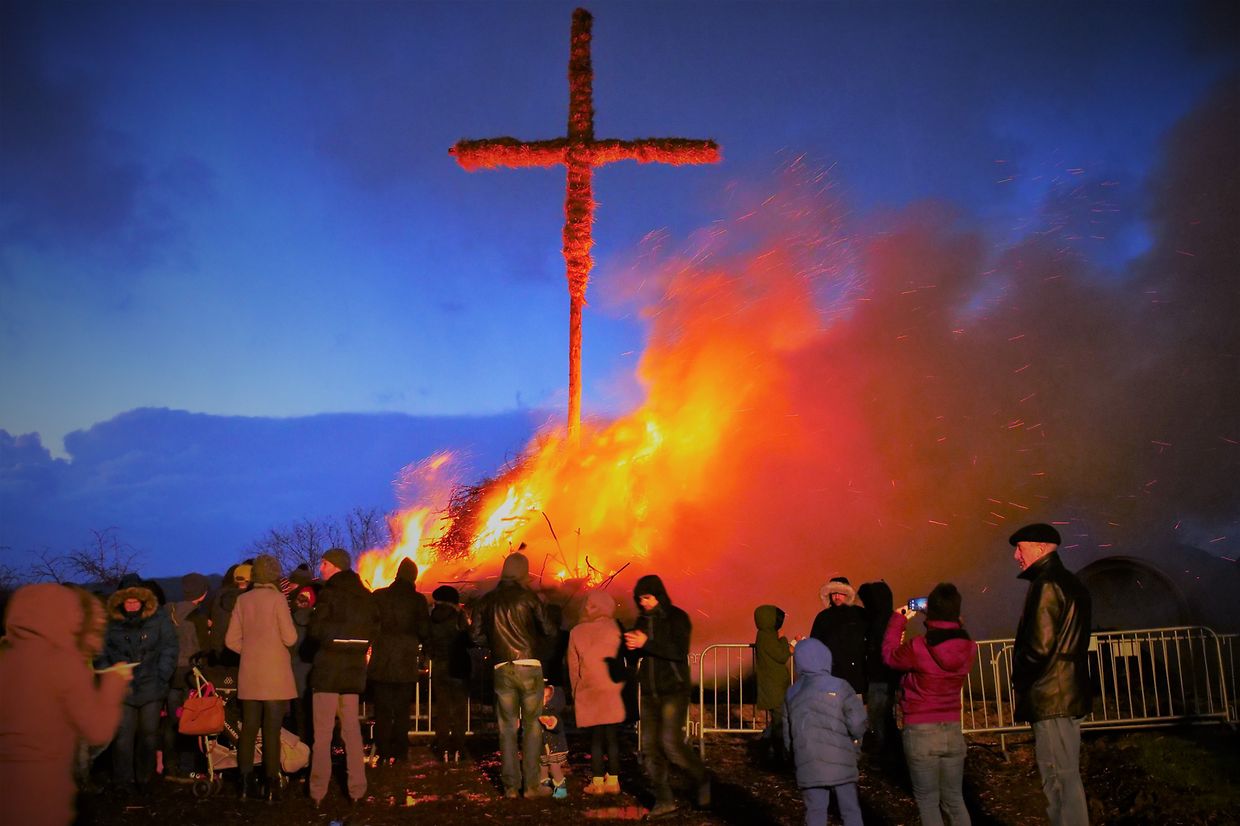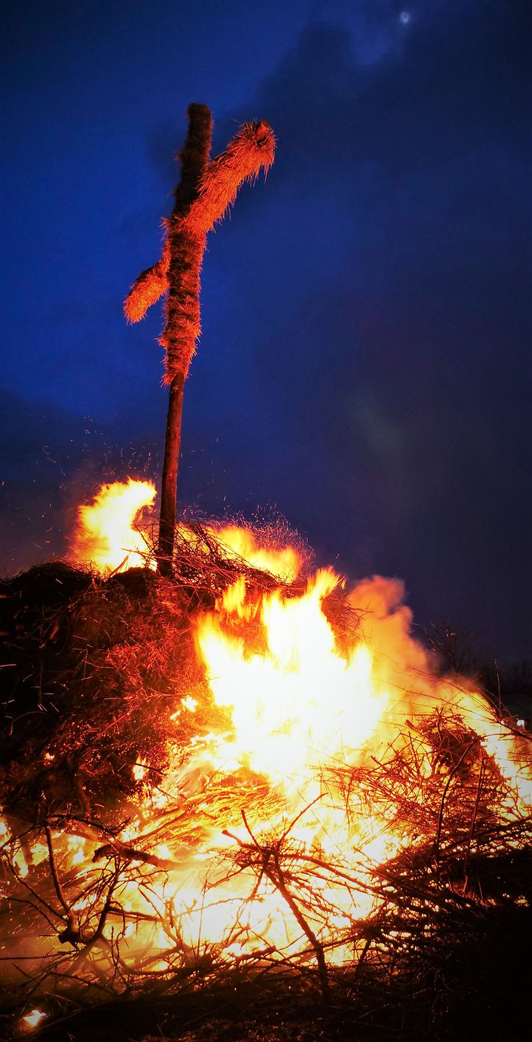 Eine Woche später sah es anfangs nicht viel besser aus, doch knapp zwei Stunden vor Beginn, riss die Wolkendecke auf und ließ einen strahlend blauen Himmel zum Vorschein. Die Schaulustigen vertrieben sich mit ein paar "Kippchen", "Humpen" und Grillwürste die Zeit ehe es gegen 19 Uhr und mit Anbruch der Dunkelheit ans Eingemachte ging: dem frisch verheirateten Paar Charlotte und Pit Brucher galt die Ehre, die "Buerg" zu entfachen. Alsbald loderte die Konstruktion lichterloh, sehr zum Vergnügen der anwesenden Kinder. Aufgehellt vom warmen Licht des Feuers ließen die Besucher den Abend mit einer wärmenden Erbsensuppe und einem letzten Drink ausklingen.