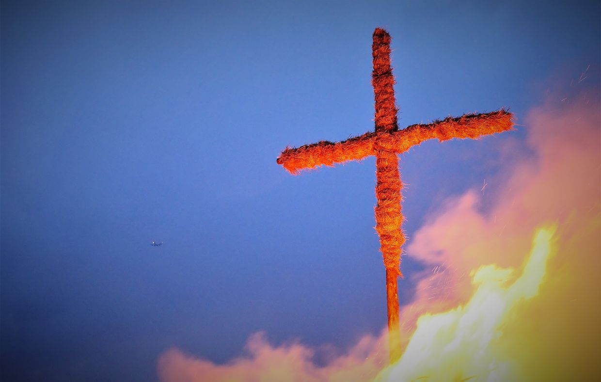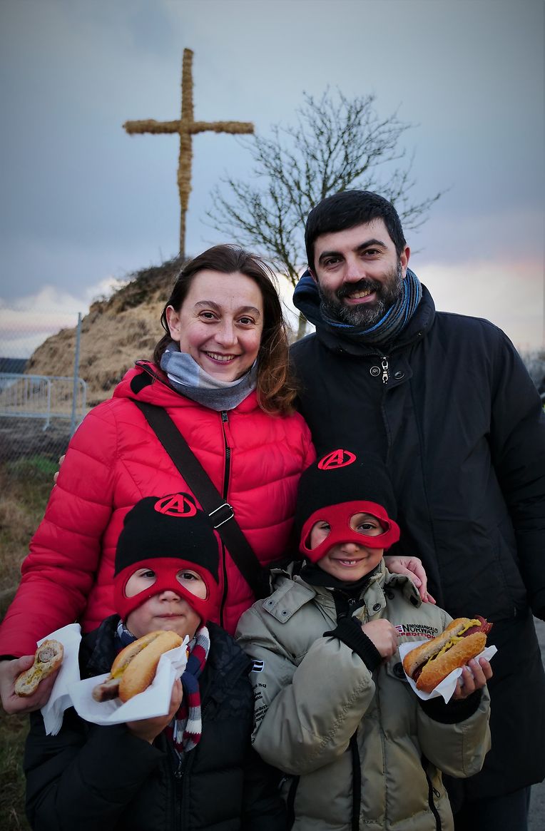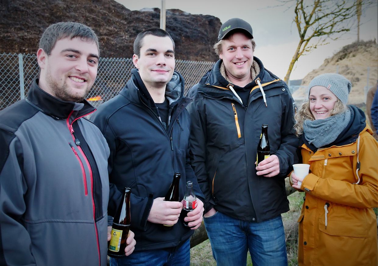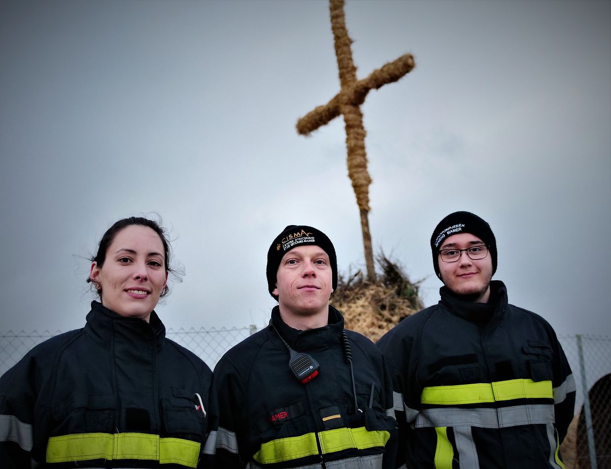 Eine Woche später sah es anfangs nicht viel besser aus, doch knapp zwei Stunden vor Beginn, riss die Wolkendecke auf und ließ einen strahlend blauen Himmel zum Vorschein. Die Schaulustigen vertrieben sich mit ein paar "Kippchen", "Humpen" und Grillwürste die Zeit ehe es gegen 19 Uhr und mit Anbruch der Dunkelheit ans Eingemachte ging: dem frisch verheirateten Paar Charlotte und Pit Brucher galt die Ehre, die "Buerg" zu entfachen. Alsbald loderte die Konstruktion lichterloh, sehr zum Vergnügen der anwesenden Kinder. Aufgehellt vom warmen Licht des Feuers ließen die Besucher den Abend mit einer wärmenden Erbsensuppe und einem letzten Drink ausklingen.