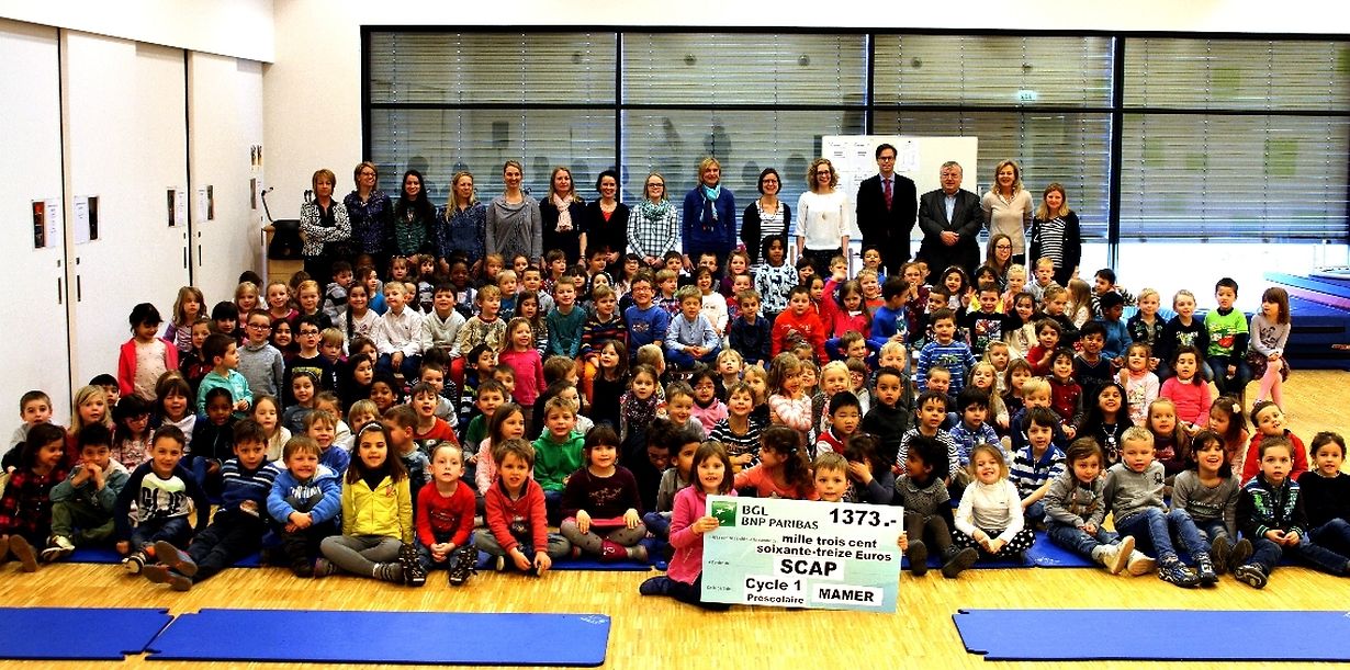 Dieses Jahr bekam der Scap (Service de consultation et d’aide pour troubles de l’attention de la perception et du développement psychomoteur) insgesamt 1.373 Euros als Unterstützung für ihre wertvolle Arbeit. In Anwesenheit des Schöffen Luc Feller, dem Präsidenten der Schulkommission Marcel Schmit sowie den fleißigen Kindern und dem Lehrerstab nahm die Scap-Direktorin Cathy Mangen den Scheck entgegen. Gemeinsam mit der beigeordneten Direktorin Eva Bodenröder bedankte sie sich bei den Schulkindern aus der Gemeinde Mamer und erklärte ihnen anschließend auf eine anschauliche Art wie ihre Vereinigung Kindern mit Aufmerksamkeitsdefizit, kognitiver und affektiver Impulsivität oder Hyperaktivität hilft.
