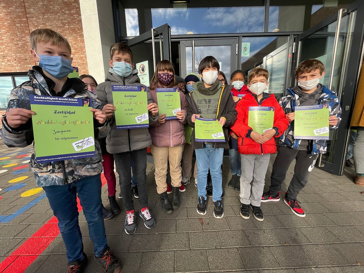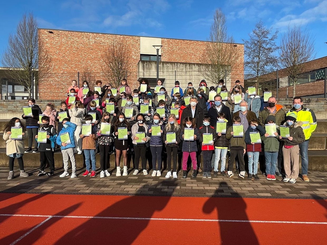 Insgesamt 63 Schüler des Cycle 3 aus der Grundschule Kinneksbond in Mamer haben am Projekt „Nachhaltigkeit macht Schule“ teilgenommen welches die Umweltsensibilisierung behandelt. Als Abschluss der Aktion bekamen die Teilnehmer bei einer sympathischen Abschlussfeier ein Diplom. Die Politik ließ es sich dann auch nicht nehmen, anlässlich dieser Diplomüberreichung sich mit den begeisterten und motivierten Schülern auszutauschen. Mit Enthusiasmus erzählten die Kinder über ihre Erfahrungen. Bei der Diplomüberreichung war der Schöffenrat, durch Luc Feller und Roger Negri, vertreten. Des Weiteren war noch das Gemeinderatsmitglied Ed Buchette, der zugleich Präsident der kommunalen Umweltkommission ist, bei der Diplomüberreichung anwesend.
