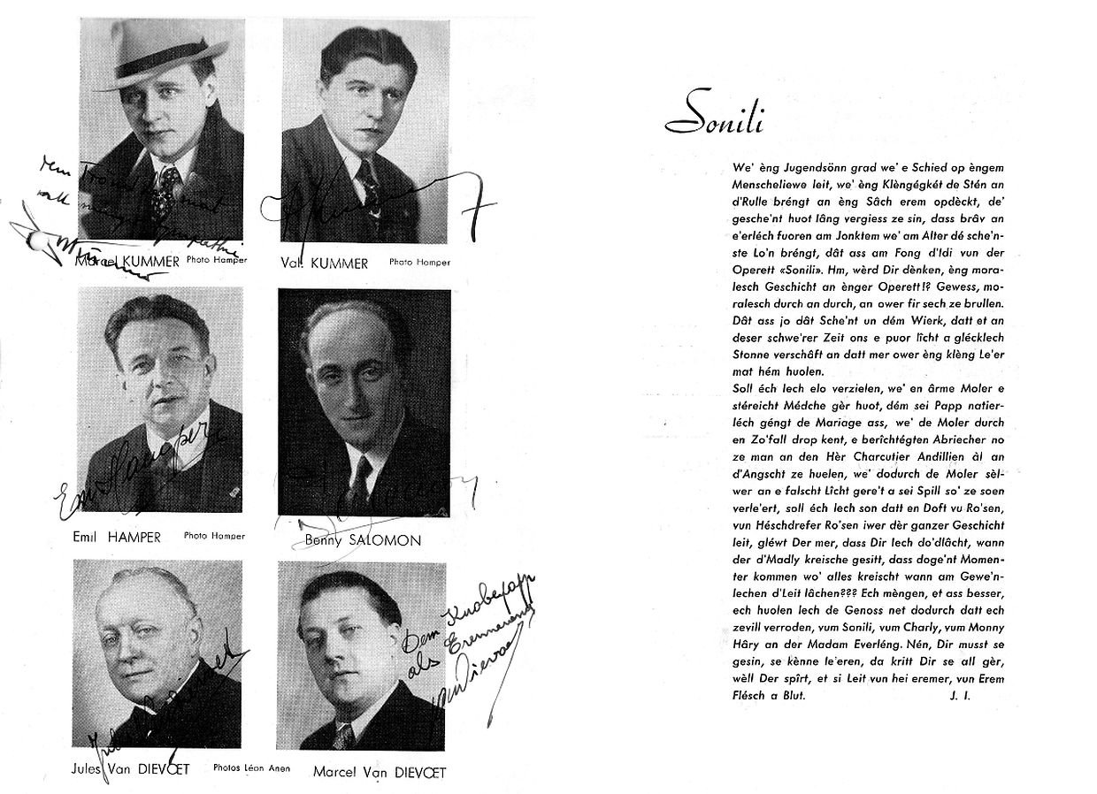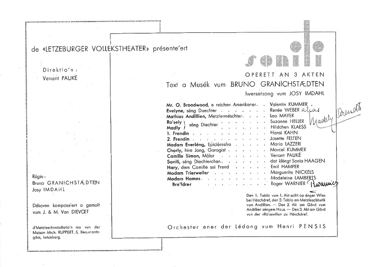 Operette vum Bruno Granichstaedten aus dem Joer 1938-39: "SONILI"! Vum Josy Imdahl an d'Lëtzebuergescht iwwersat. D'Ueropféierung wor den 15 Dezember 1939.