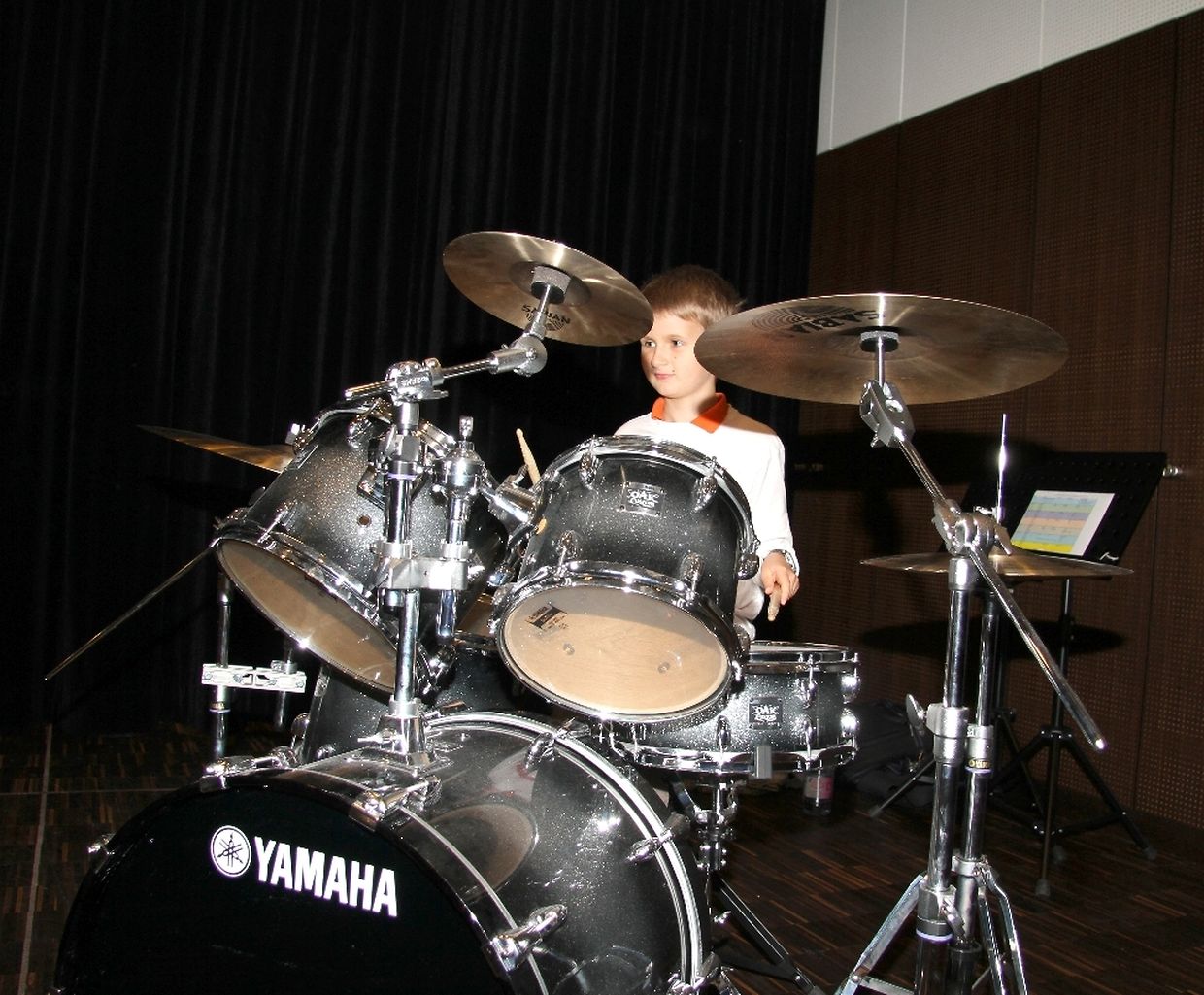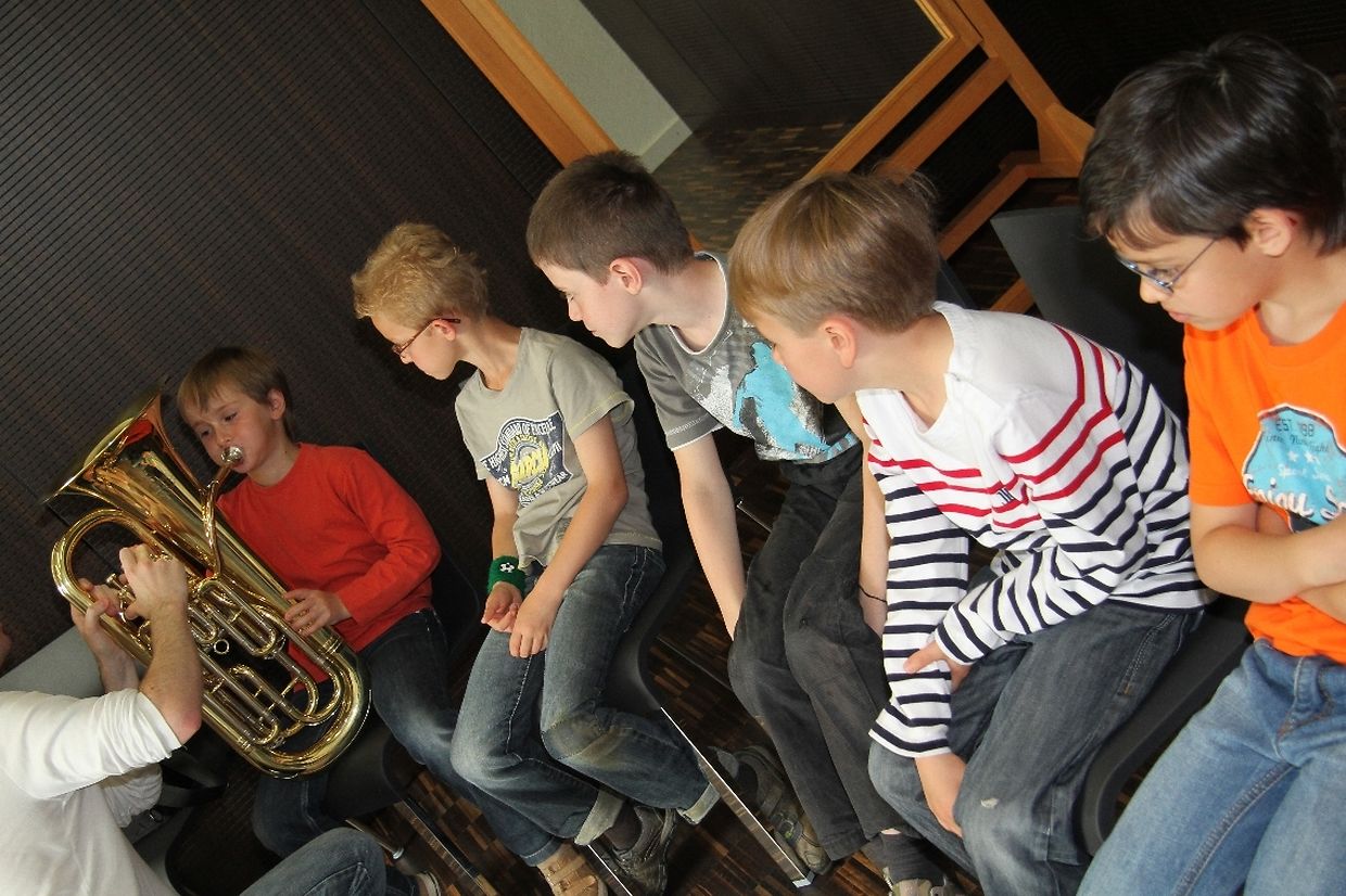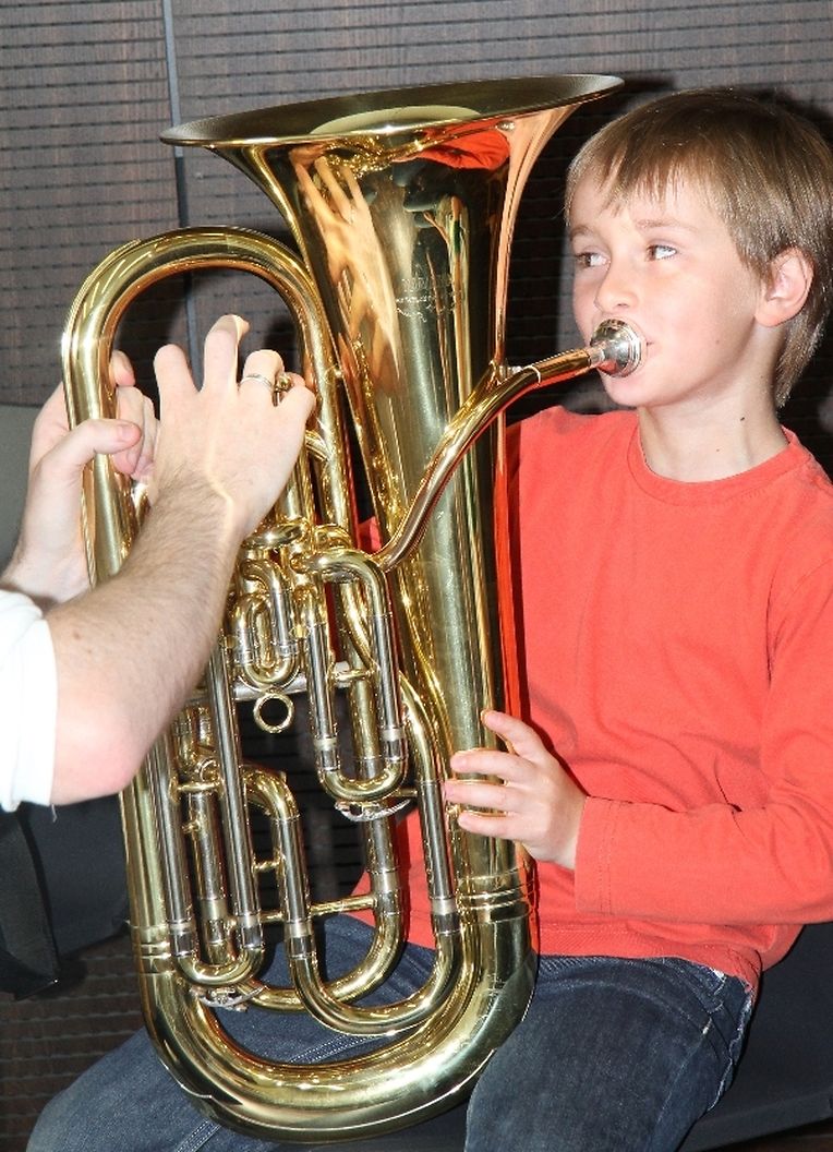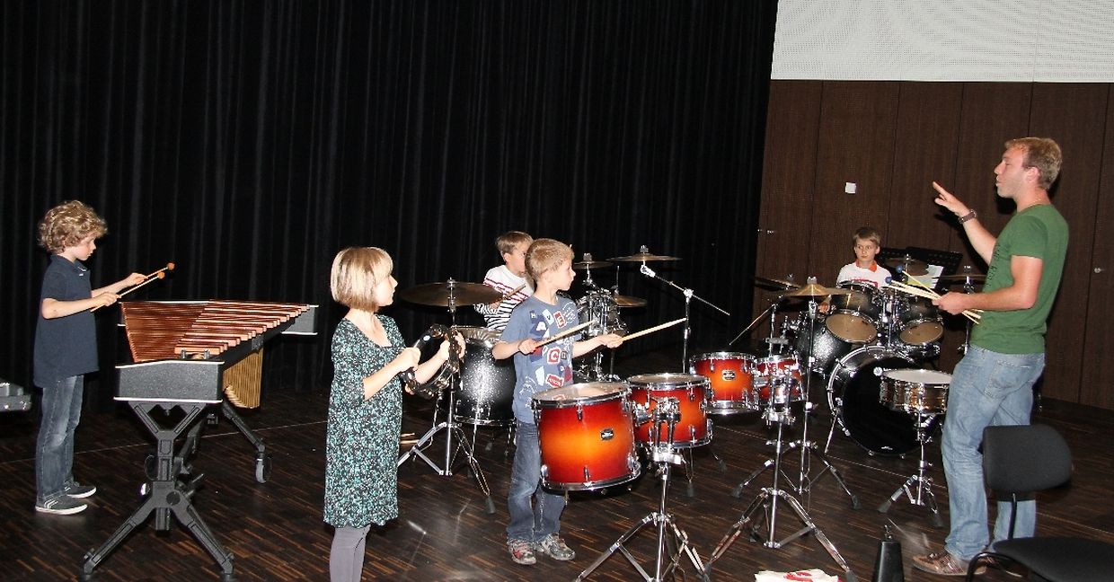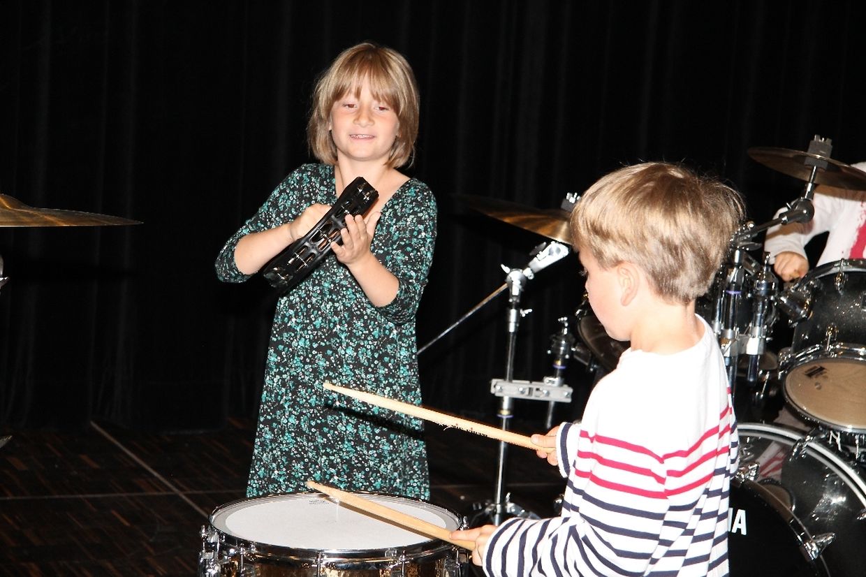 Die Schulkinder der zweiten Klasse aus Mamer konnten sich drei Stationen aus den angebotenen sechs aussuchen. Um die 80 Schüler passierten an dem Tag im Kulturzentrum. 20 Minuten waren vorgesehen pro Workshop in denen die Kinder die Möglichkeit hatten die verschiedenen Instrumente kennenzulernen, sie anzufassen, anzuhören und darauf zu spielen. Hoch im Kurs lag der in diesem Jahr neu angebotene Schlagzeugkurs, doch auch die Elektro-Guitarre und die Blasinstrumente waren beliebte Ziele der vielleicht angehenden Musiker.