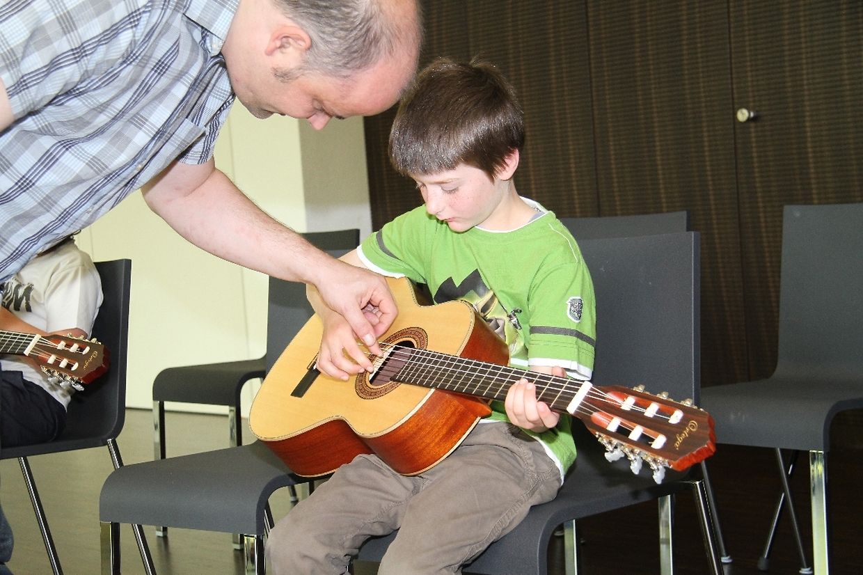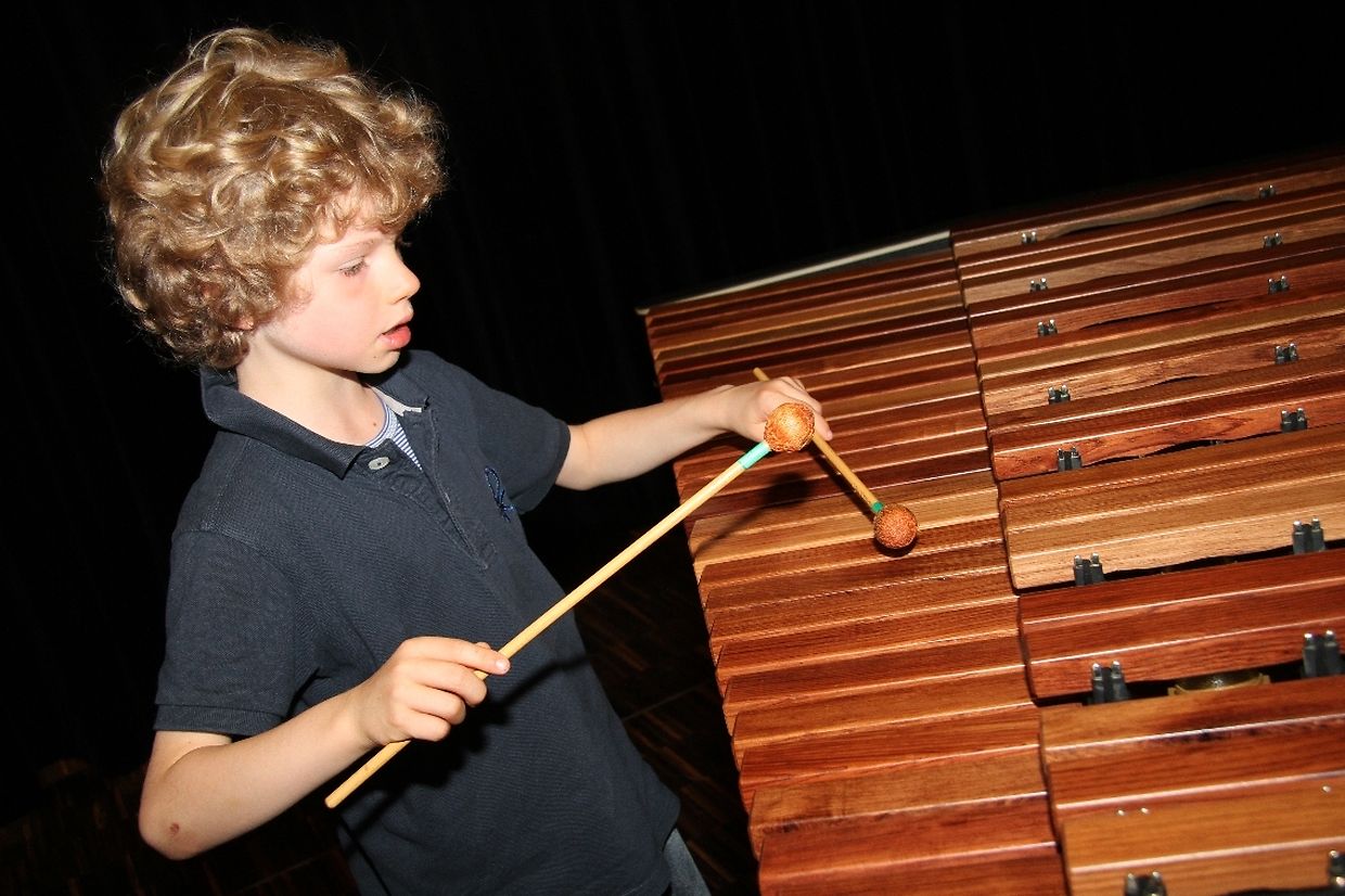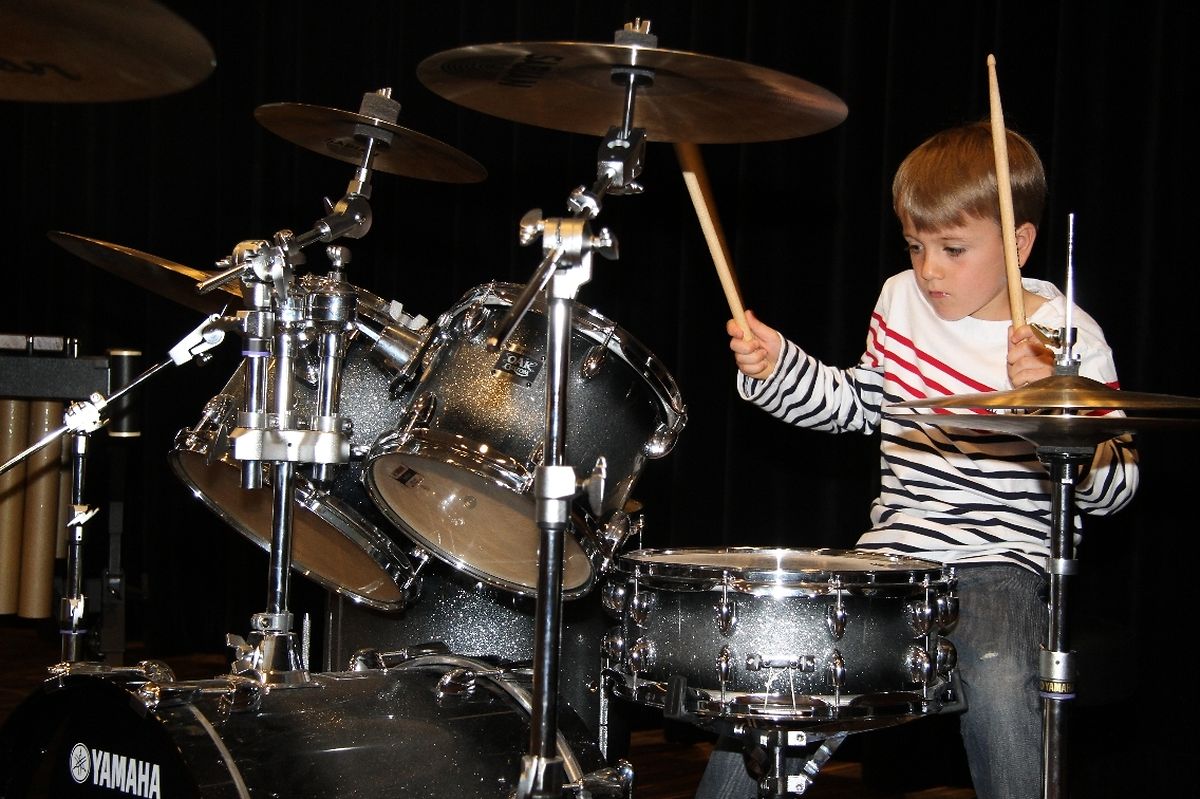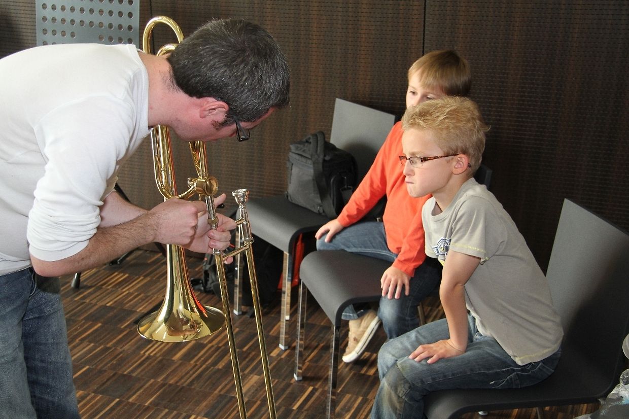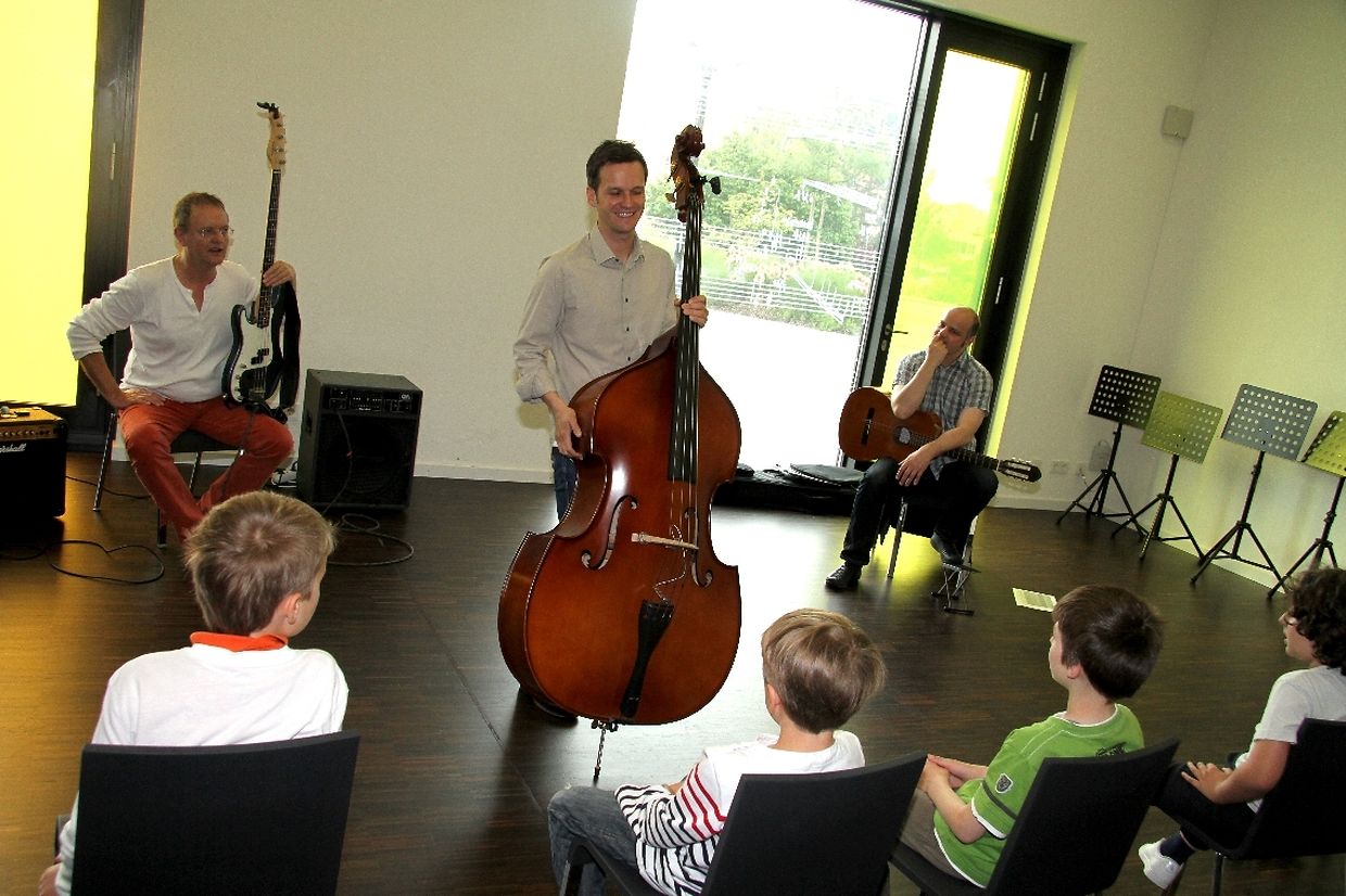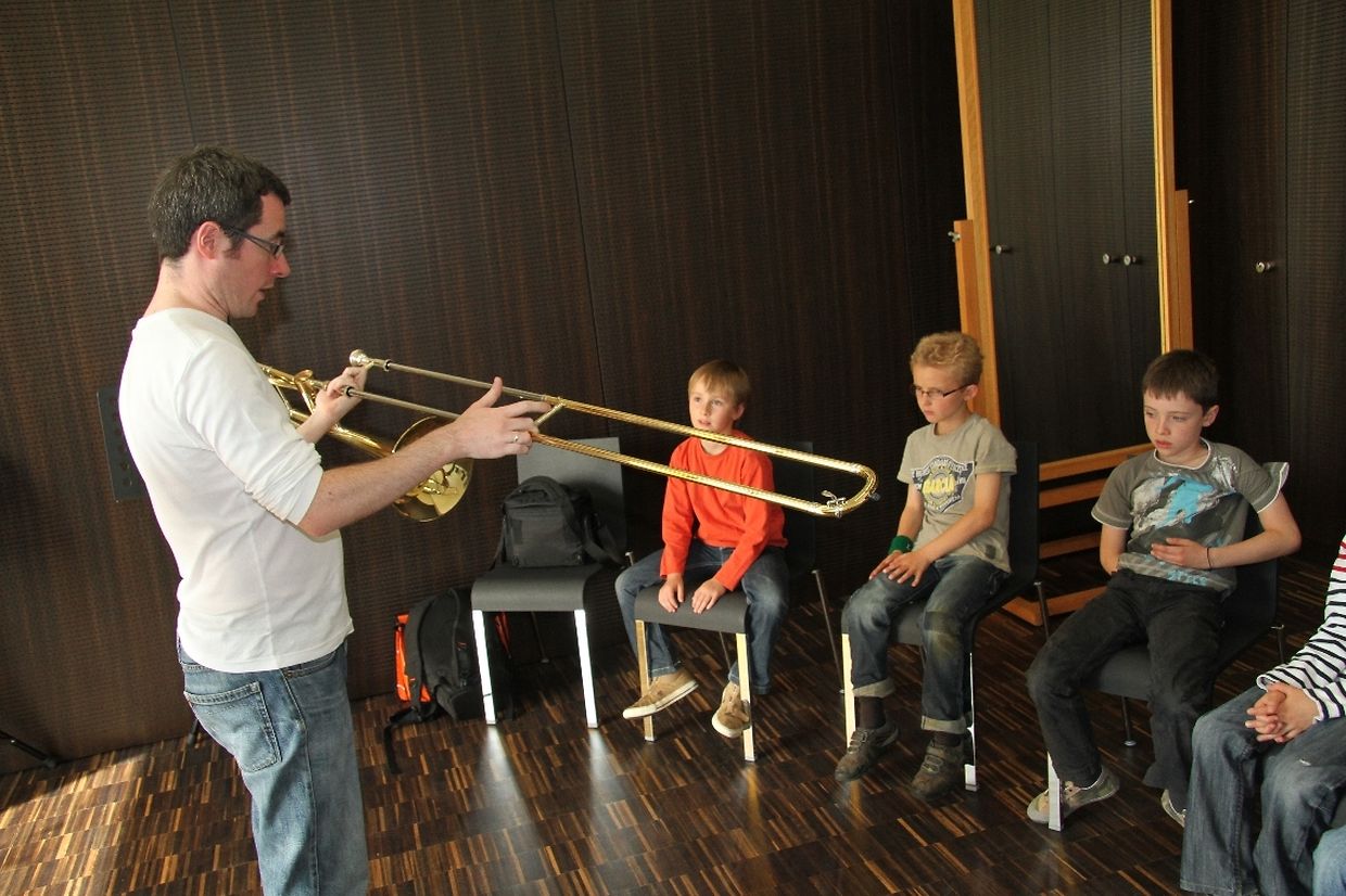 Die Schulkinder der zweiten Klasse aus Mamer konnten sich drei Stationen aus den angebotenen sechs aussuchen. Um die 80 Schüler passierten an dem Tag im Kulturzentrum. 20 Minuten waren vorgesehen pro Workshop in denen die Kinder die Möglichkeit hatten die verschiedenen Instrumente kennenzulernen, sie anzufassen, anzuhören und darauf zu spielen. Hoch im Kurs lag der in diesem Jahr neu angebotene Schlagzeugkurs, doch auch die Elektro-Guitarre und die Blasinstrumente waren beliebte Ziele der vielleicht angehenden Musiker.